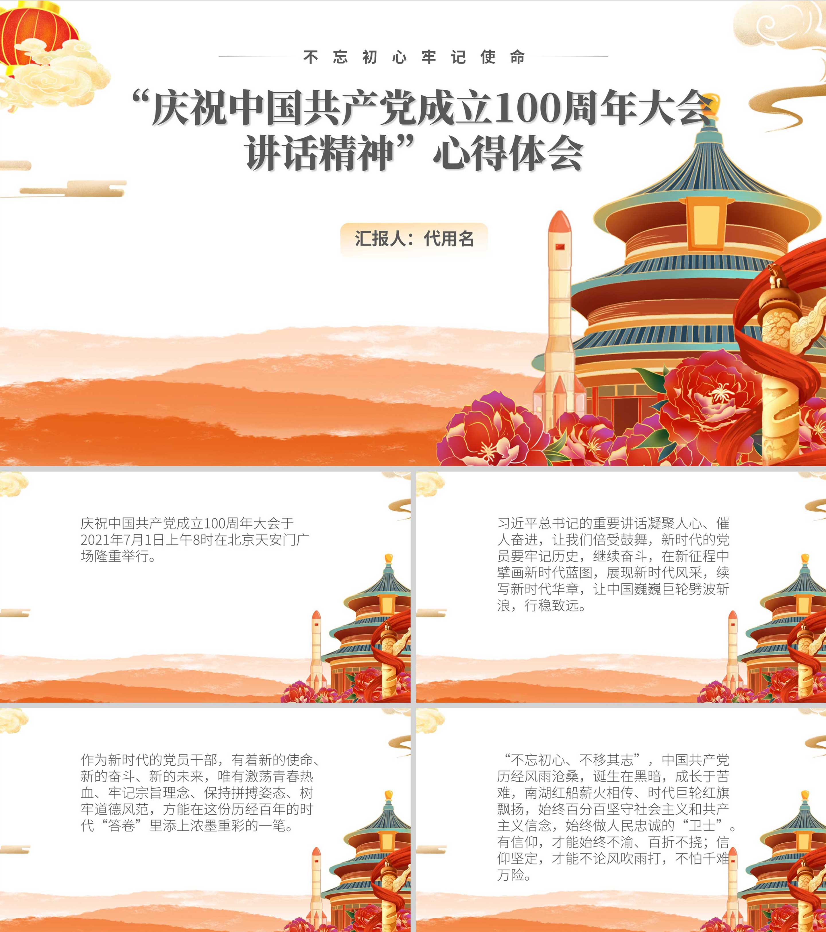 中国风庆祝建党百年讲话精神心得PPT模板