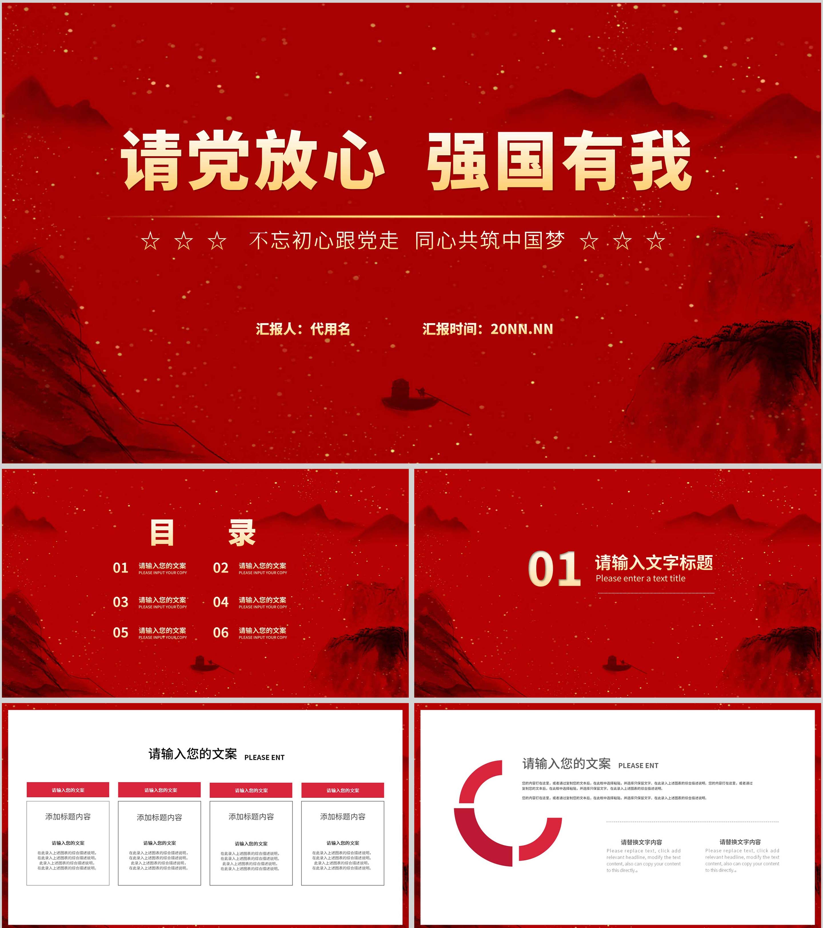 红色中国风水墨爱国党政军警报告PPT模板