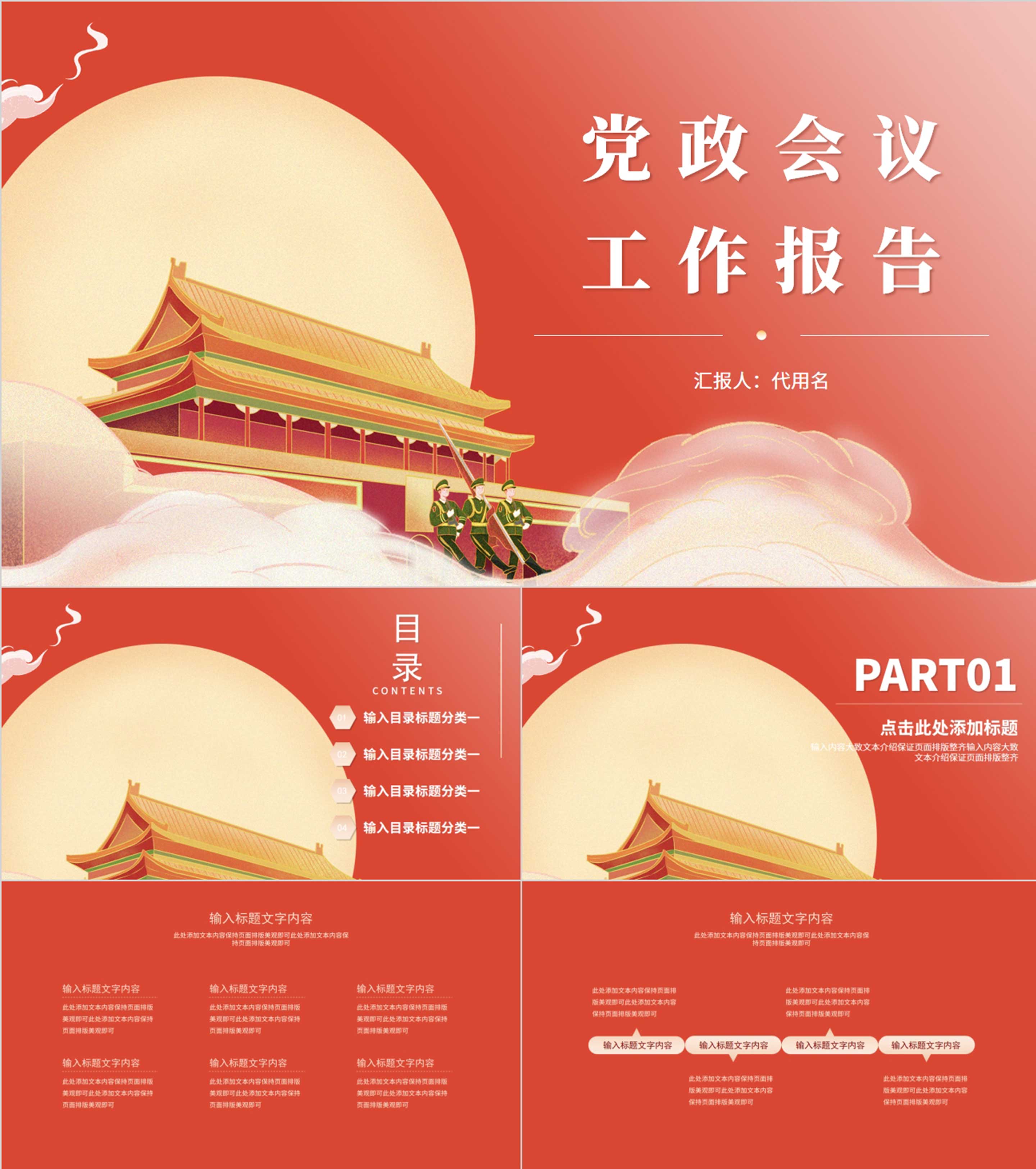 红色插画风中秋党政会议工作报告PPT模板