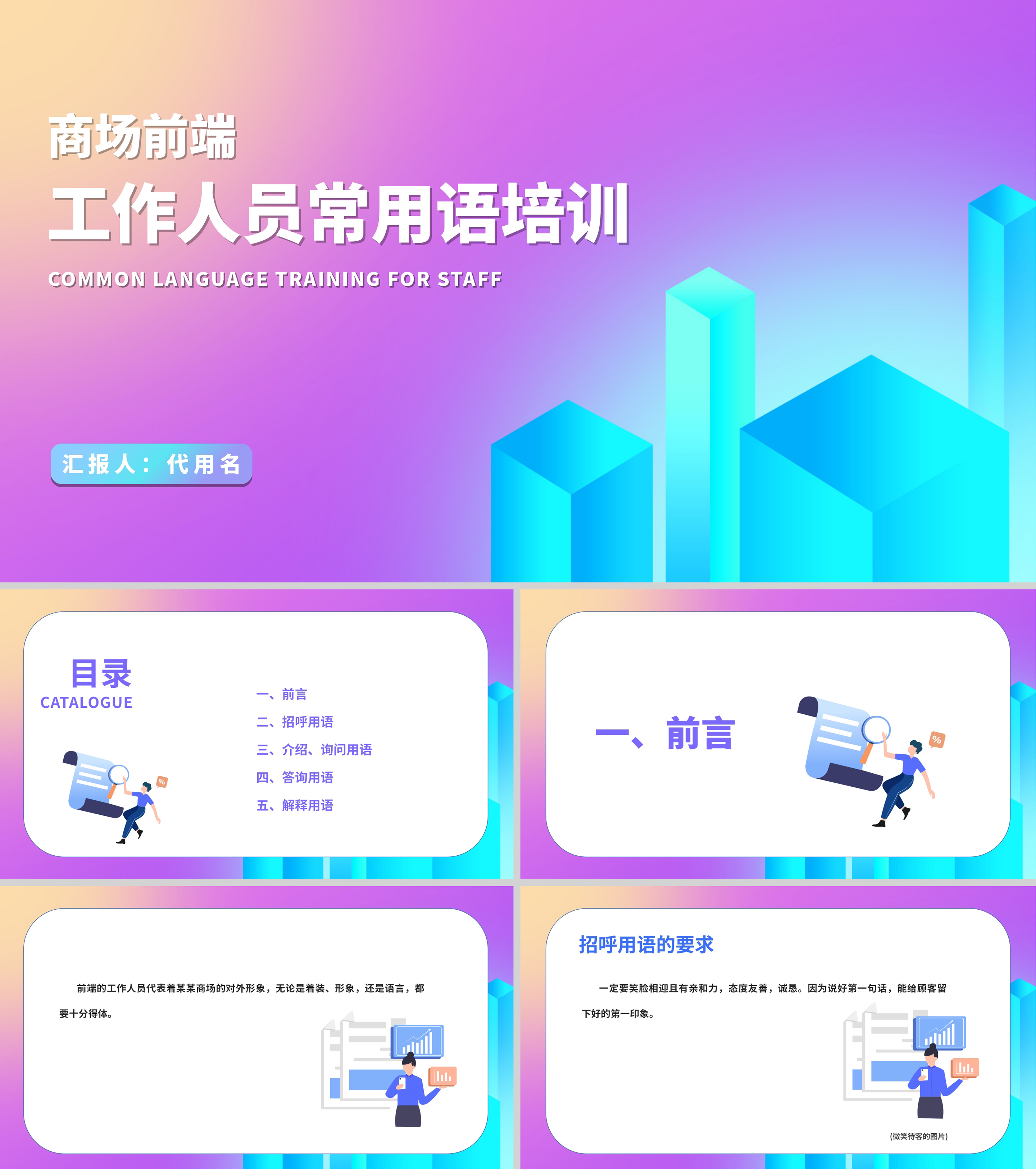 粉色渐变扁平风商场工作人员销售技巧话术培训PPT模板