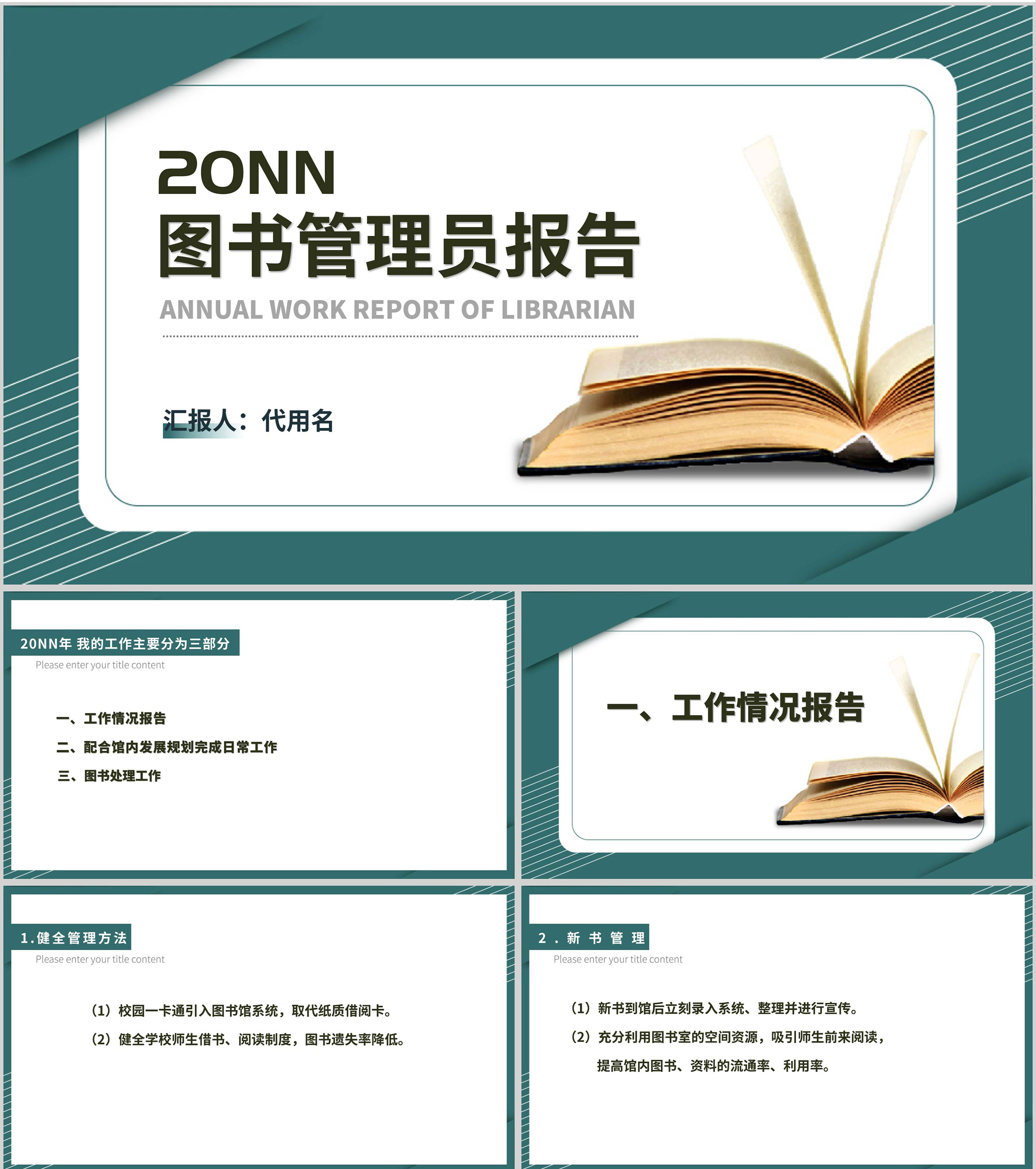 绿色简约风图书管理工作报告PPT模板