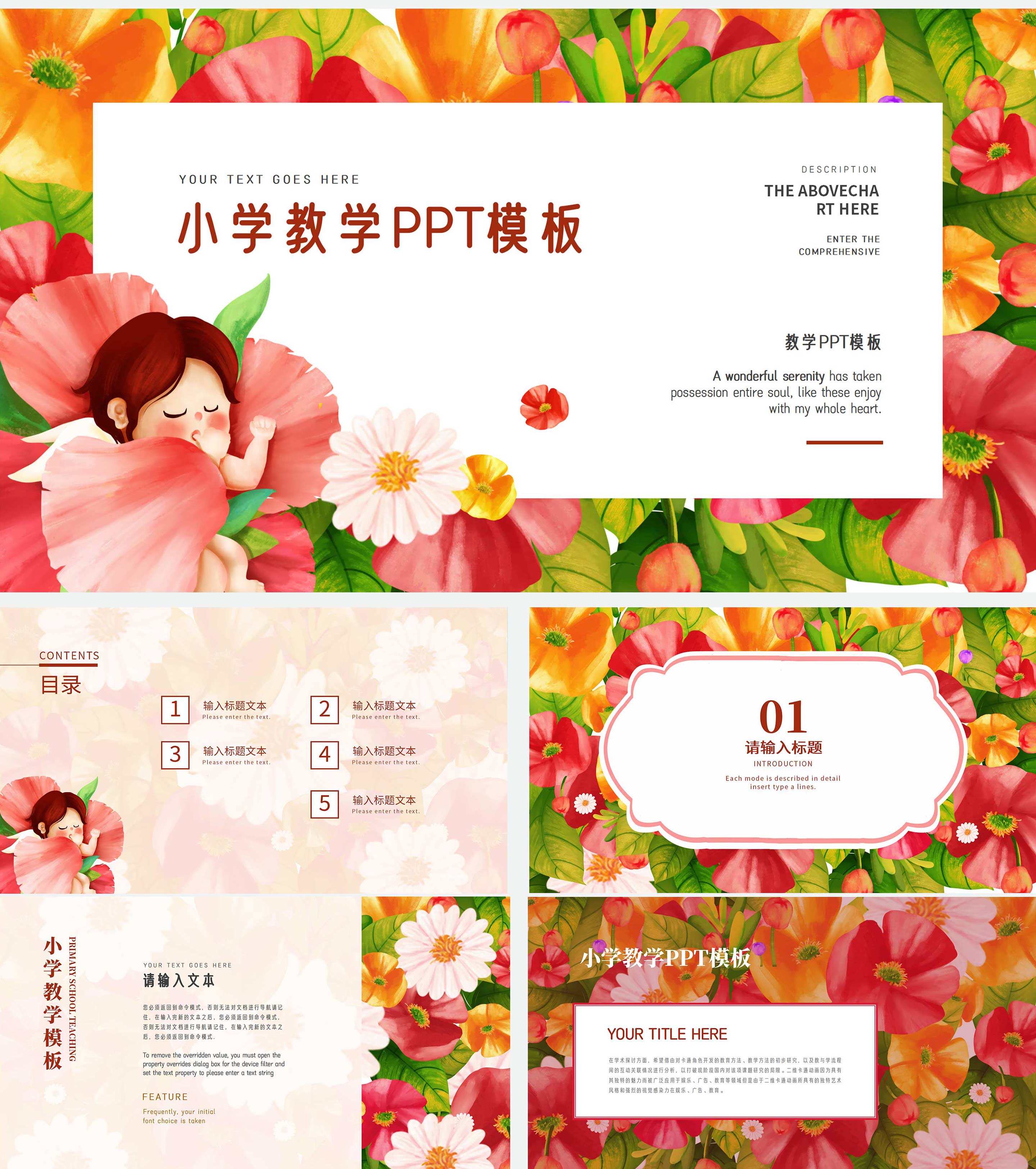 红色卡通水彩花朵小学教学PPT模板