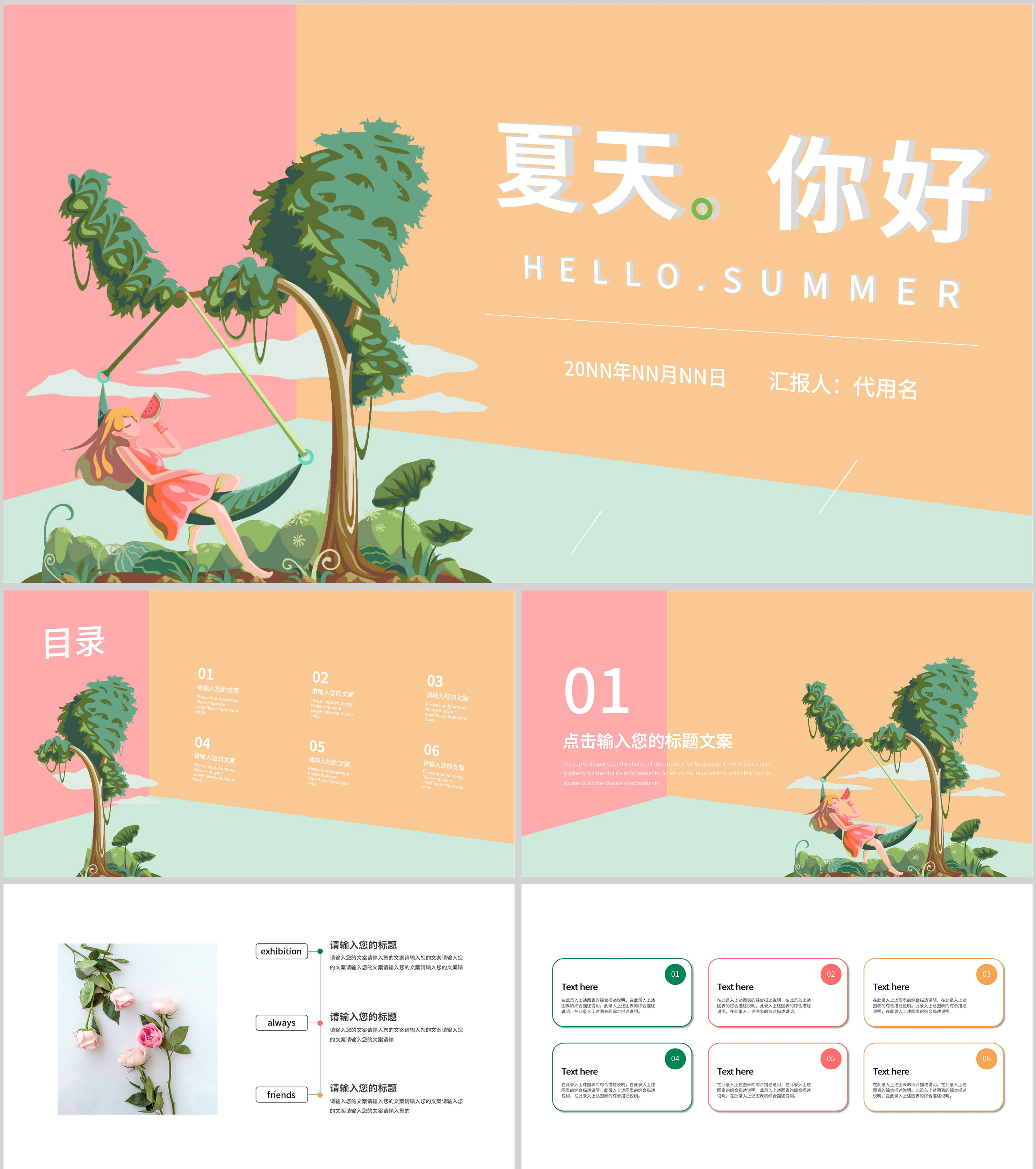 黄色插画风夏天你好PPT模板