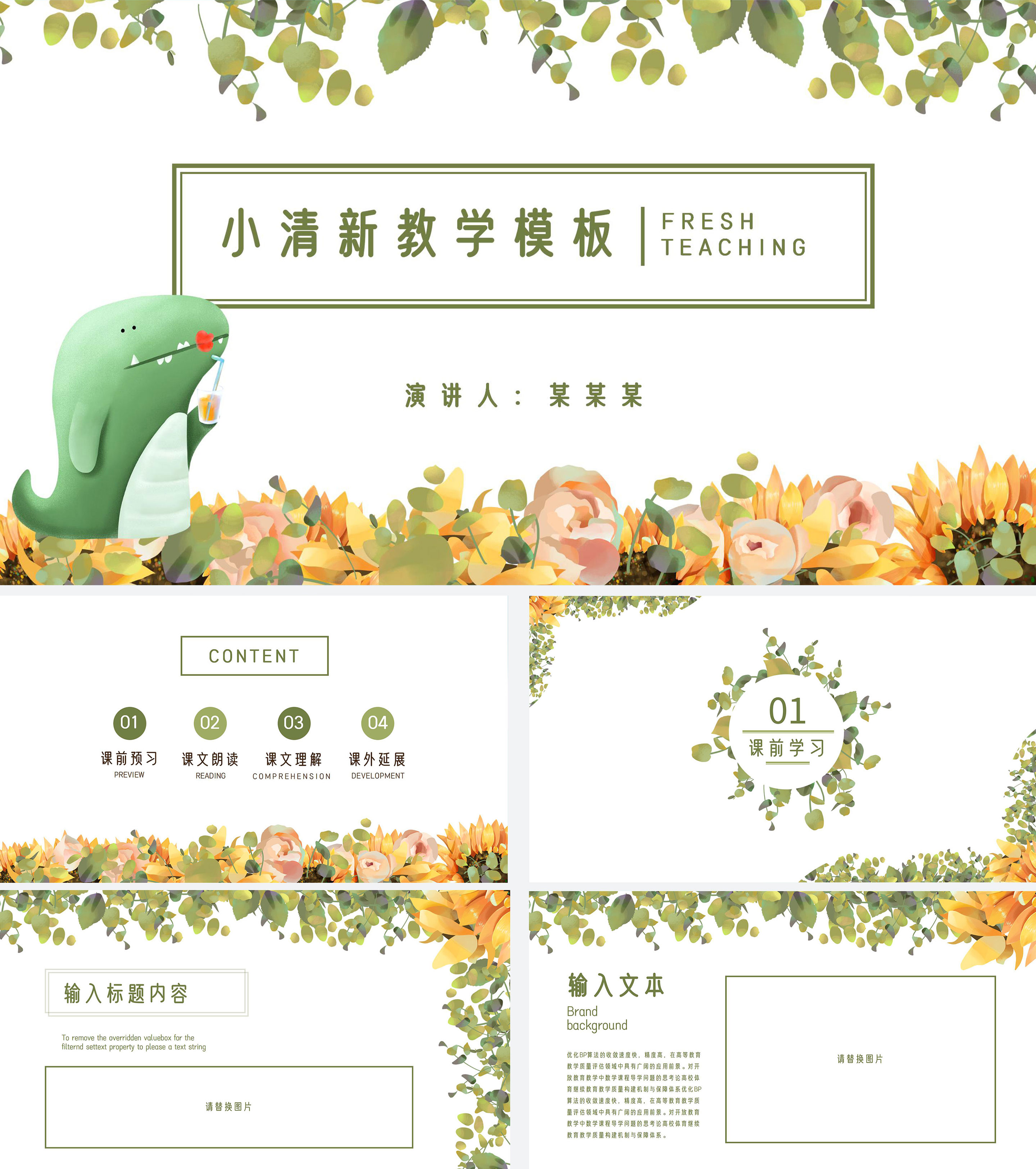 绿色卡通花卉可爱小学教学PPT模板