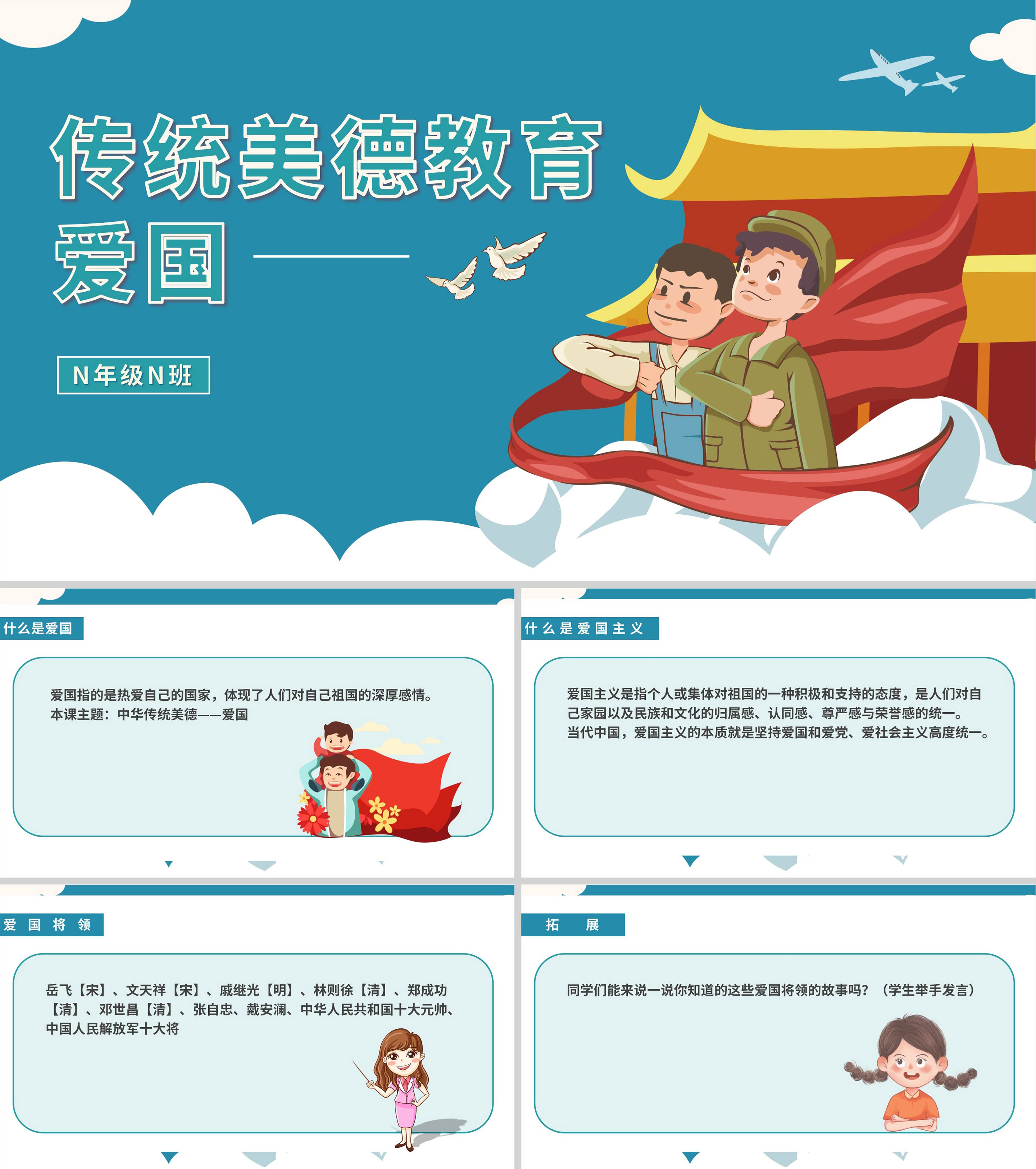 蓝色卡通风传统爱国PPT模板