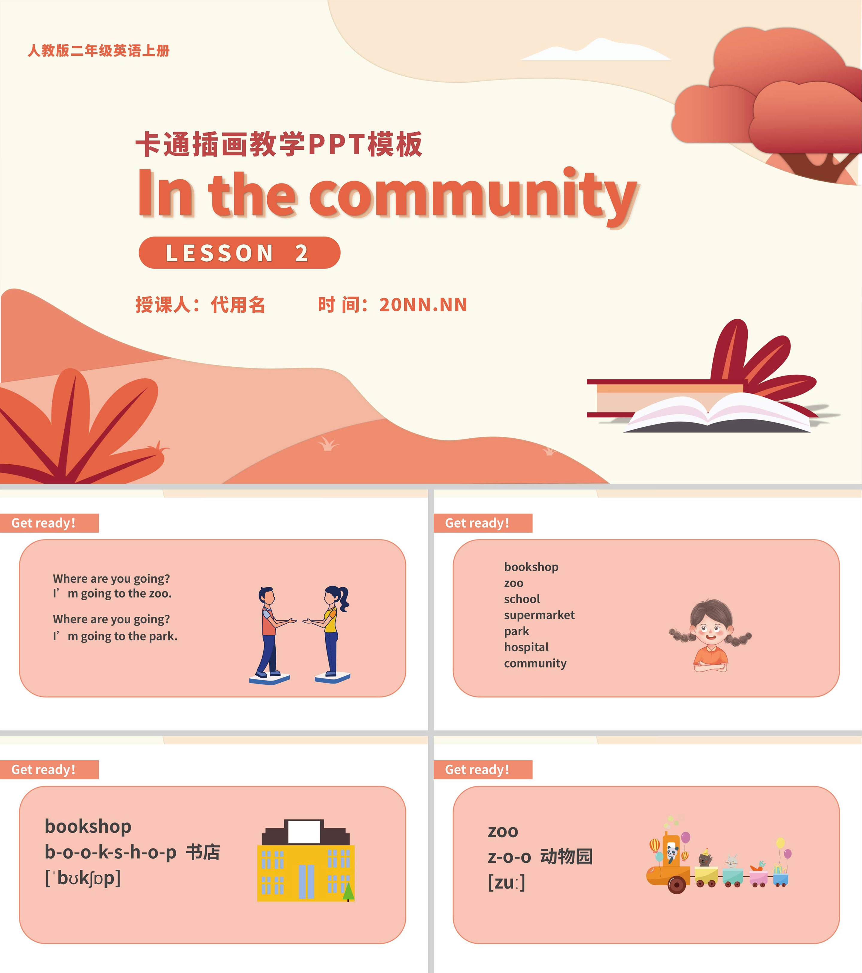 红色插画风二年级英语上册生活地点PPT模板