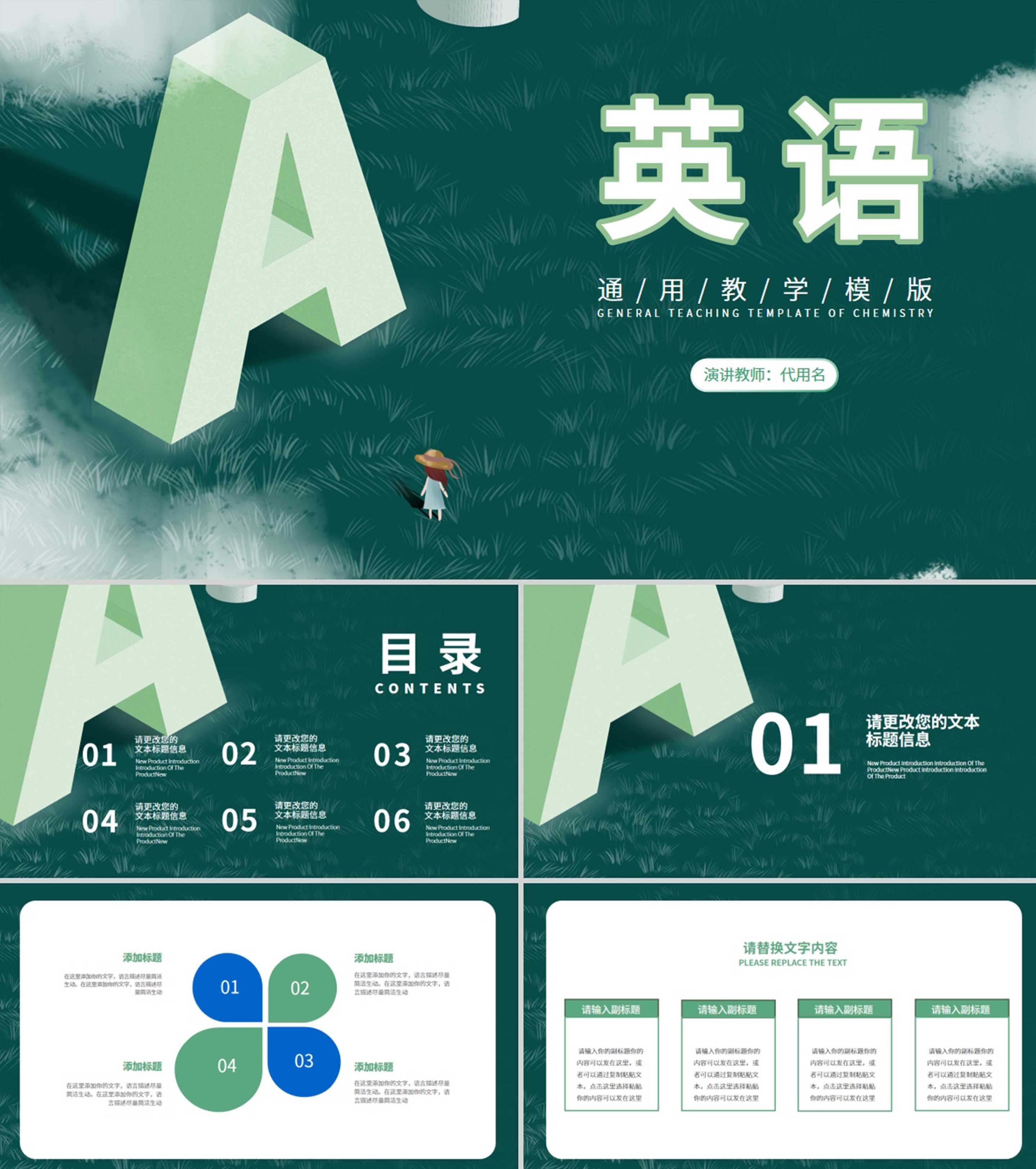 小清新绿色草地小女孩英语教学PPT模板
