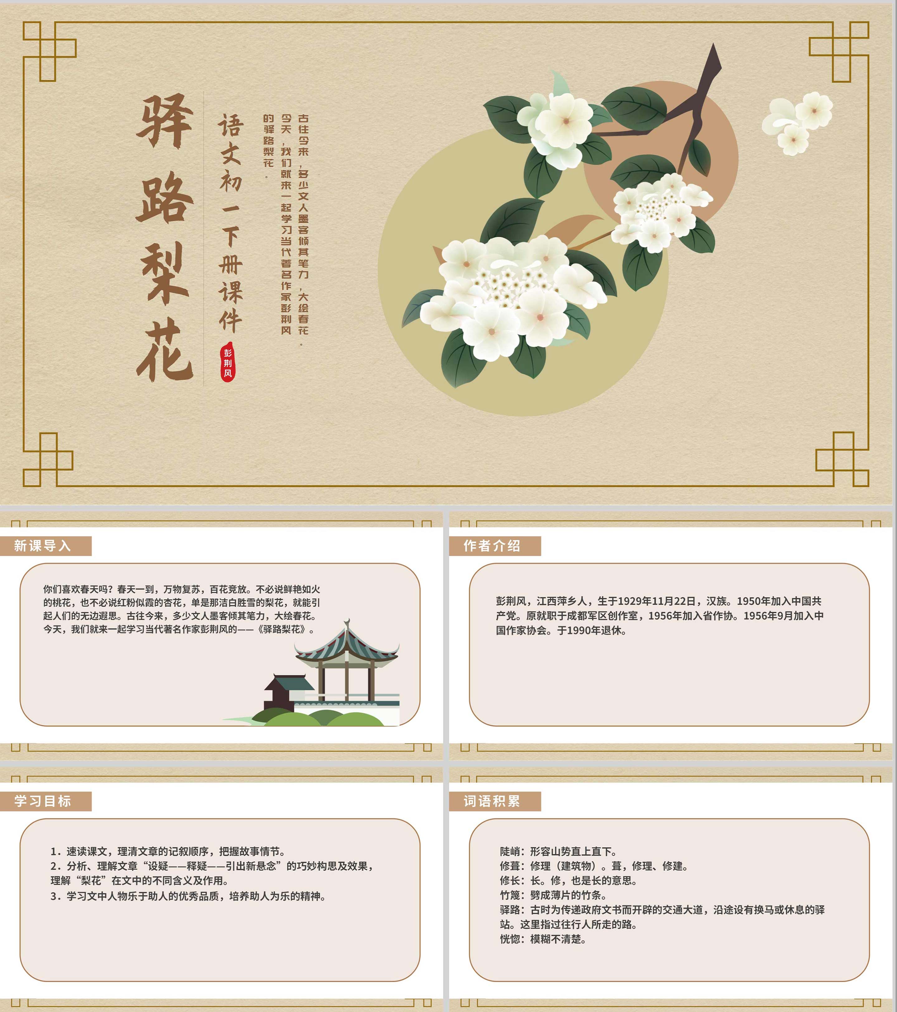 黄色中国风中式语文初一下册驿路梨花教学课件PPT模板
