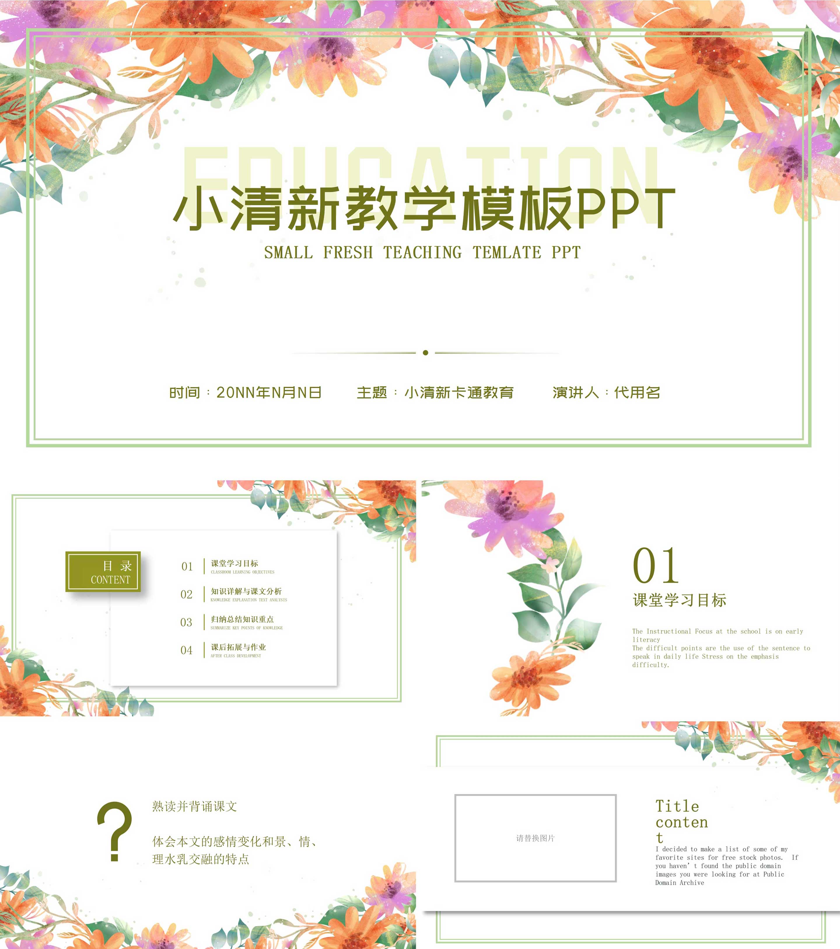 白色小清新花卉教学通用PPT模板