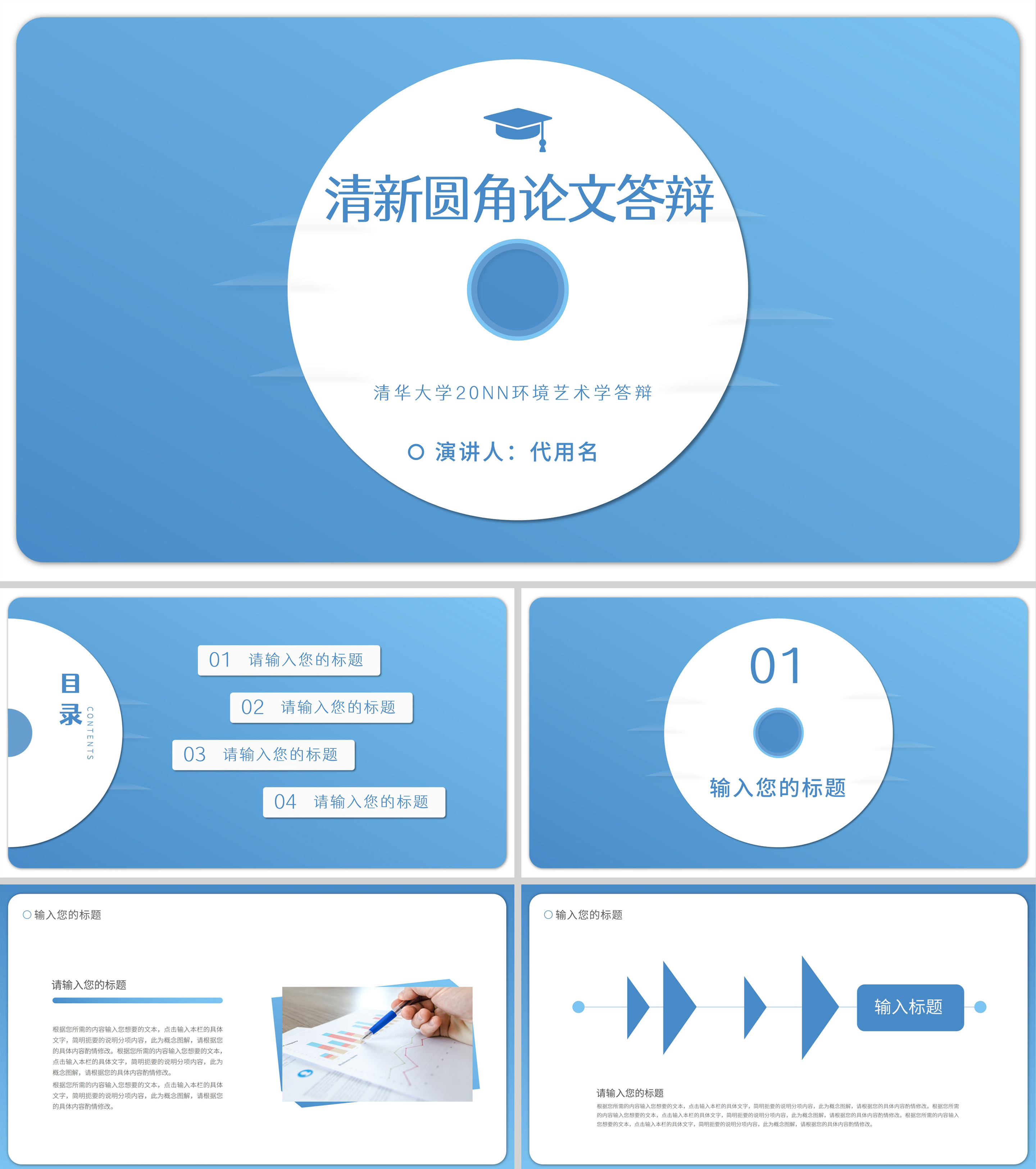蓝色清新圆角风论文答辩PPT模板
