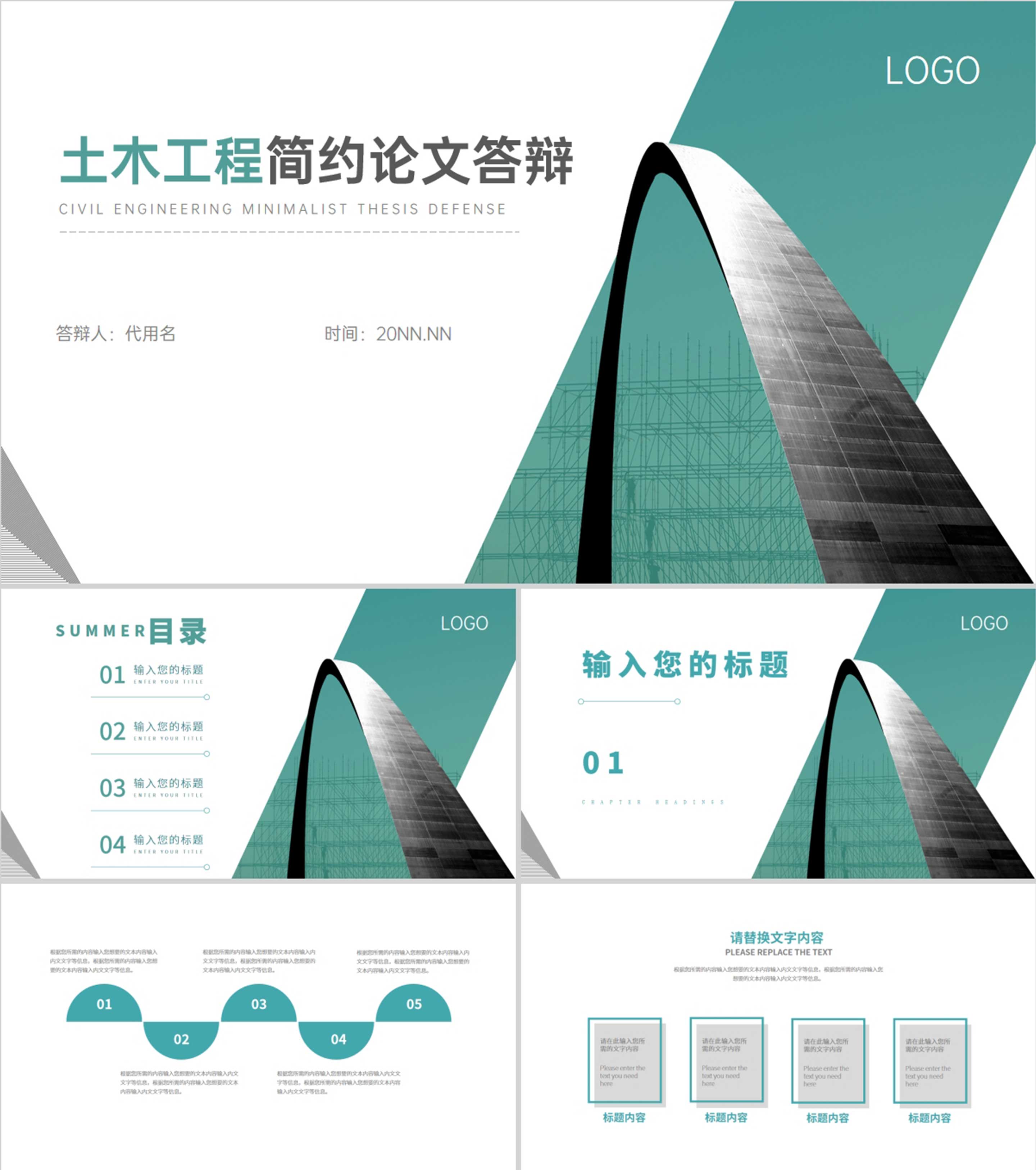 简约青色建筑土木工程论文答辩汇报PPT模板