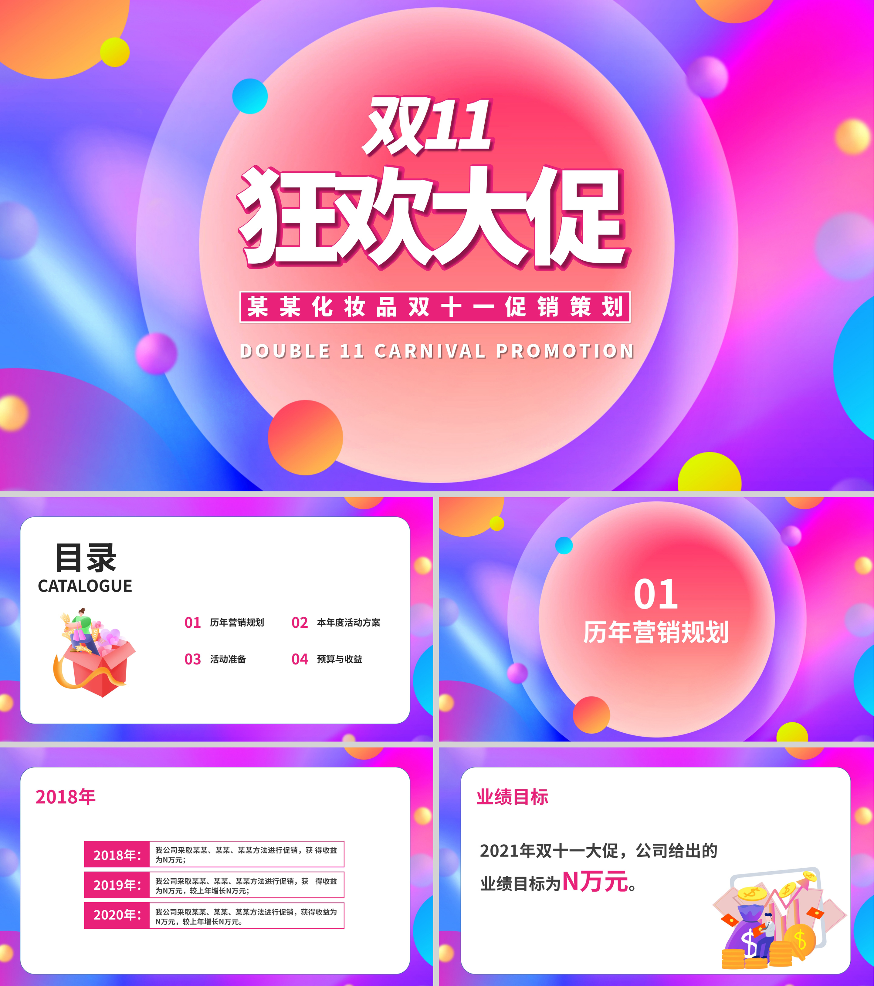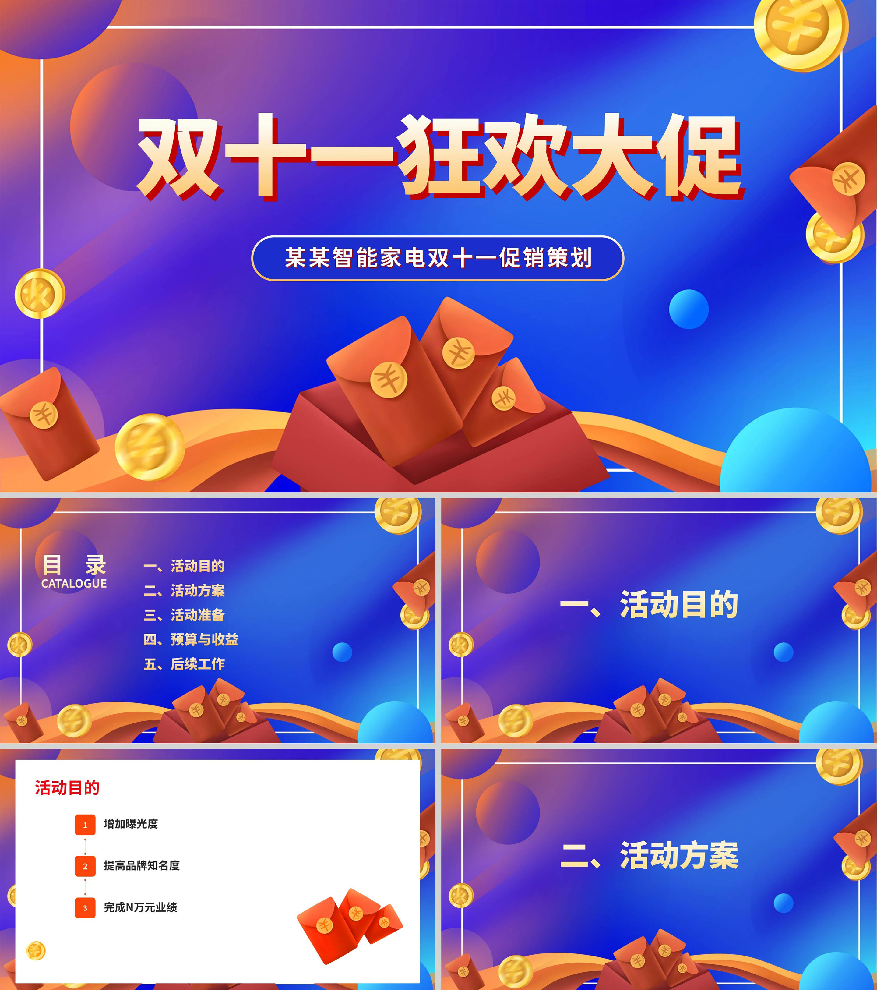 蓝色插画风双十一红包策划PPT模板