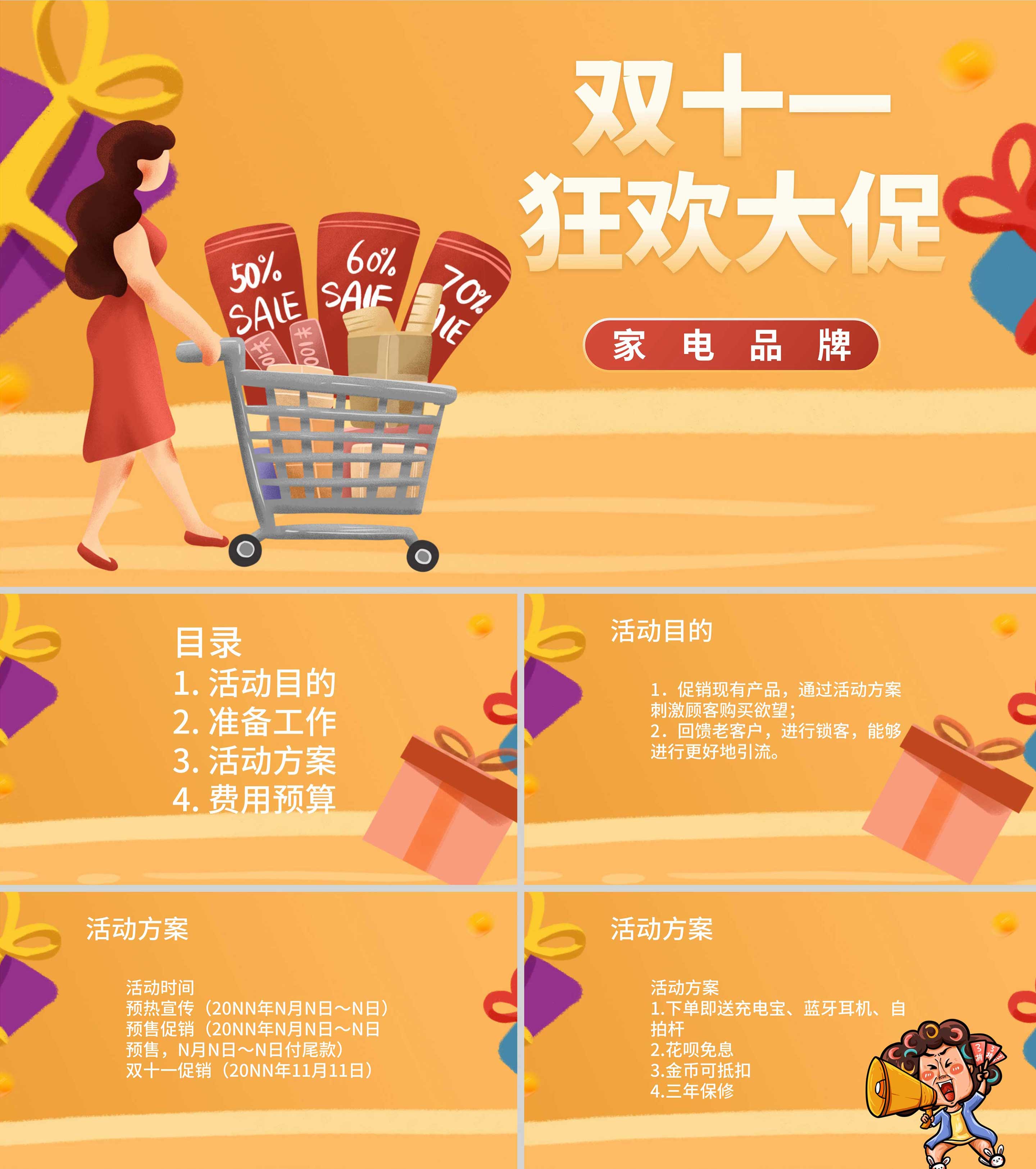 橙色插画风家电购物双十一活动大促PPT模板