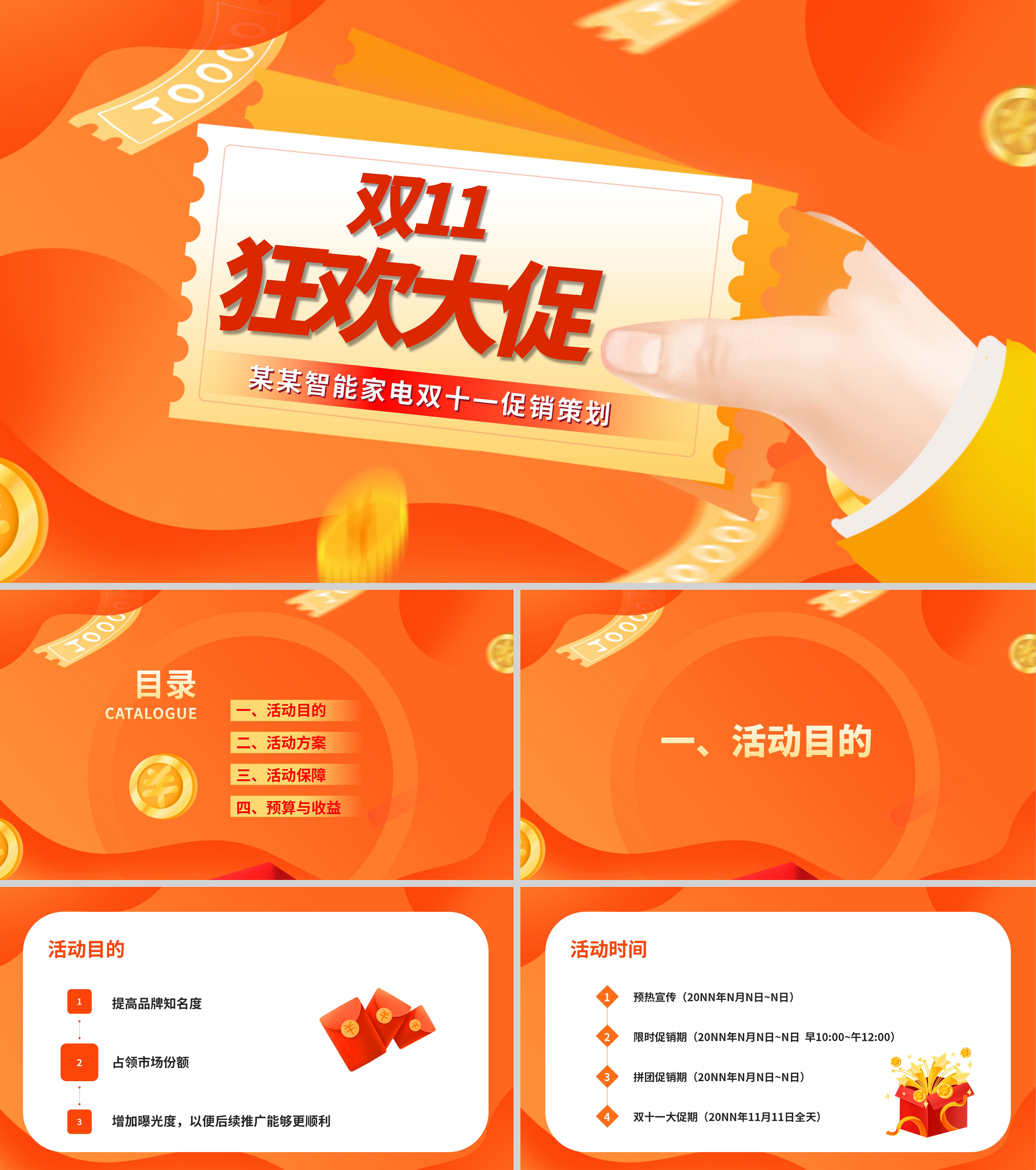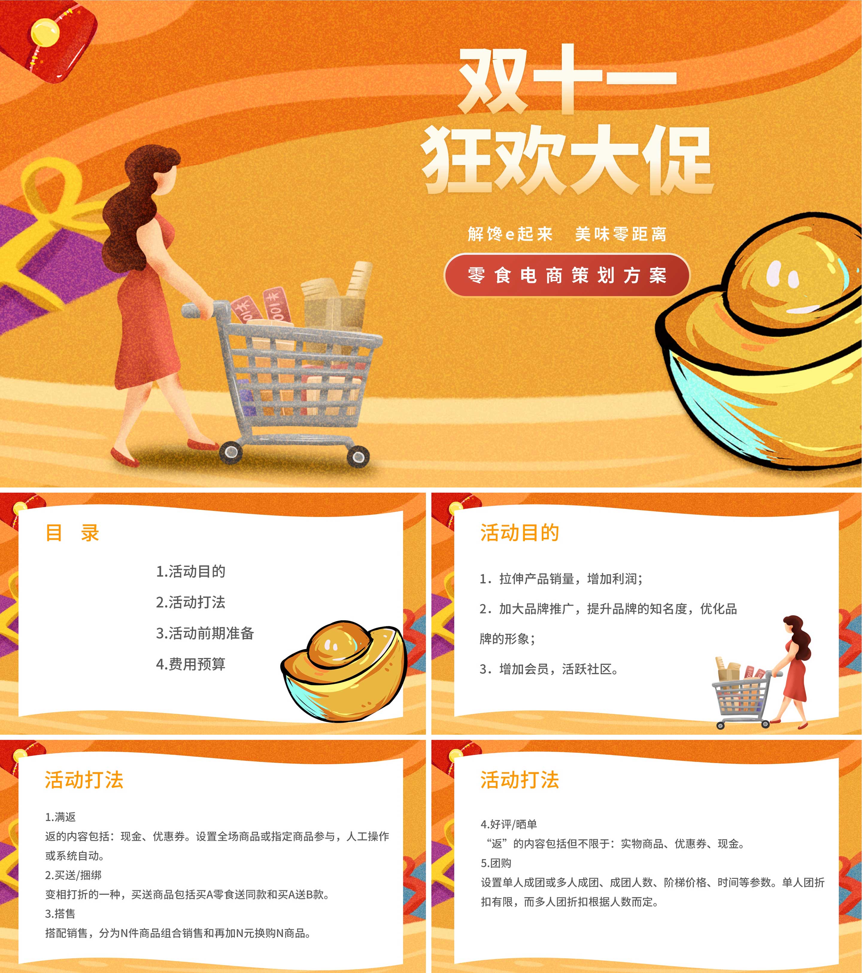 橙色插画风双十一狂欢大促策划PPT模板
