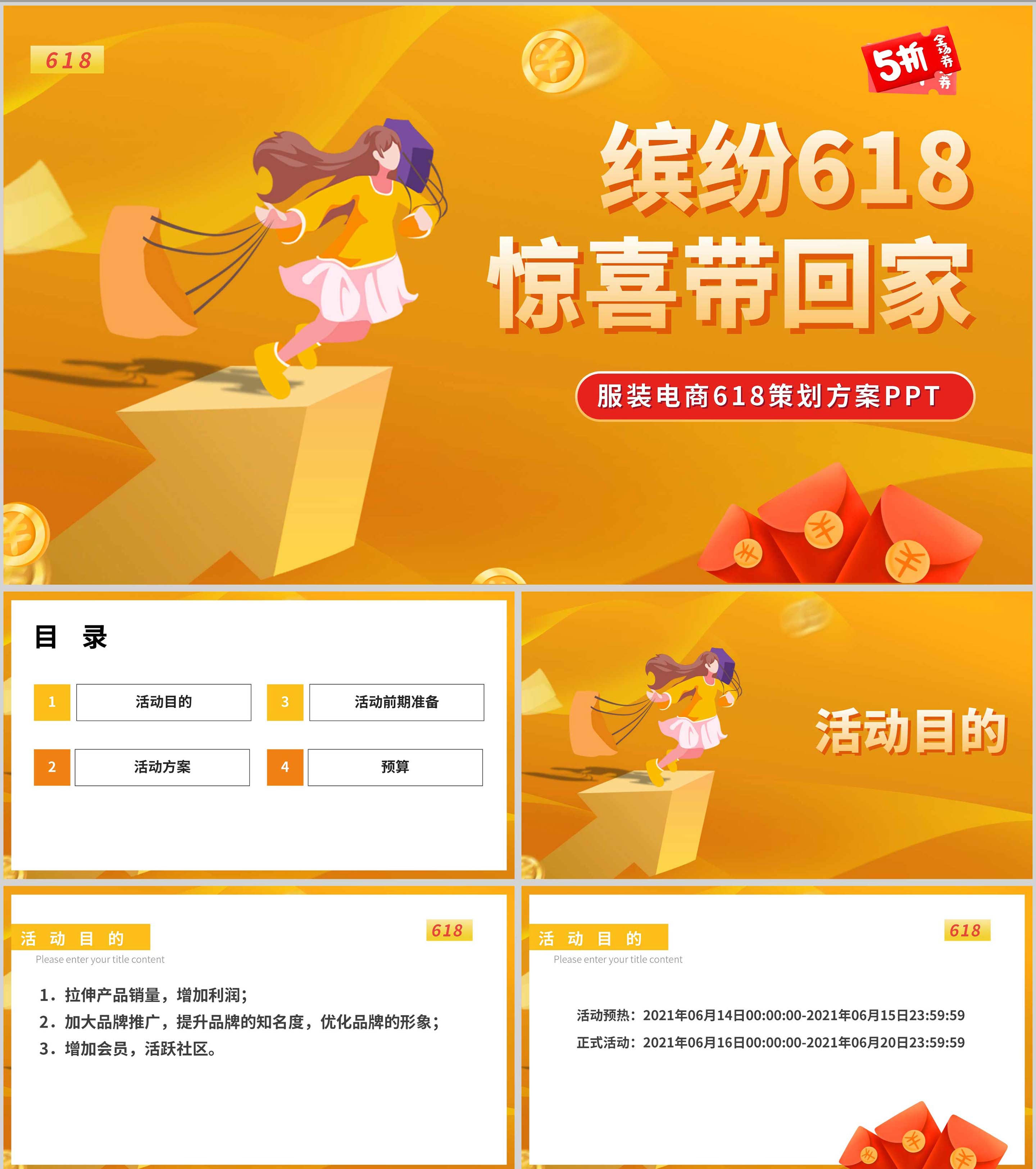 橙色扁平风购物女孩活动策划方案PPT模板