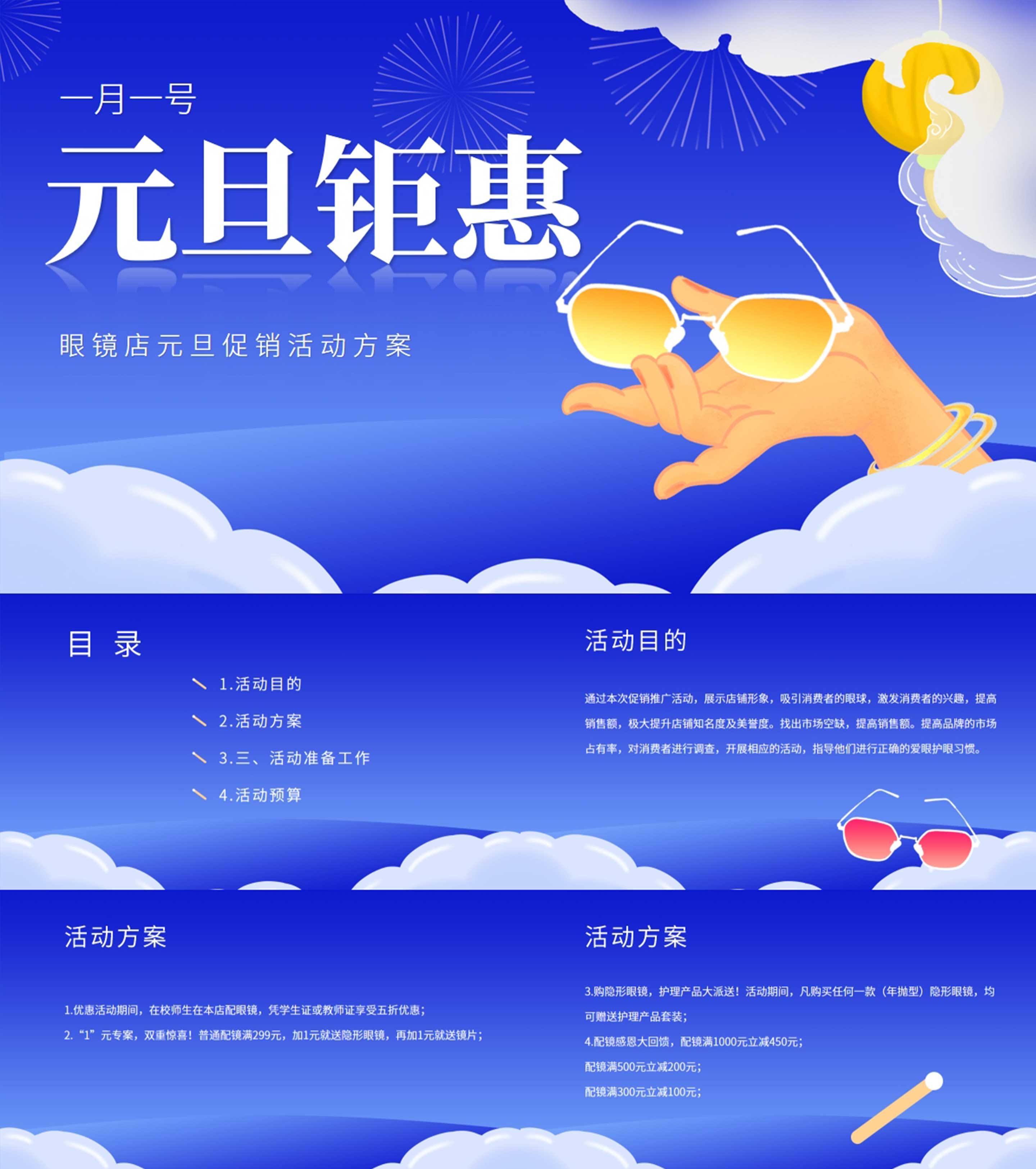 蓝色插画风眼镜店元旦促销活动策划PPT方案