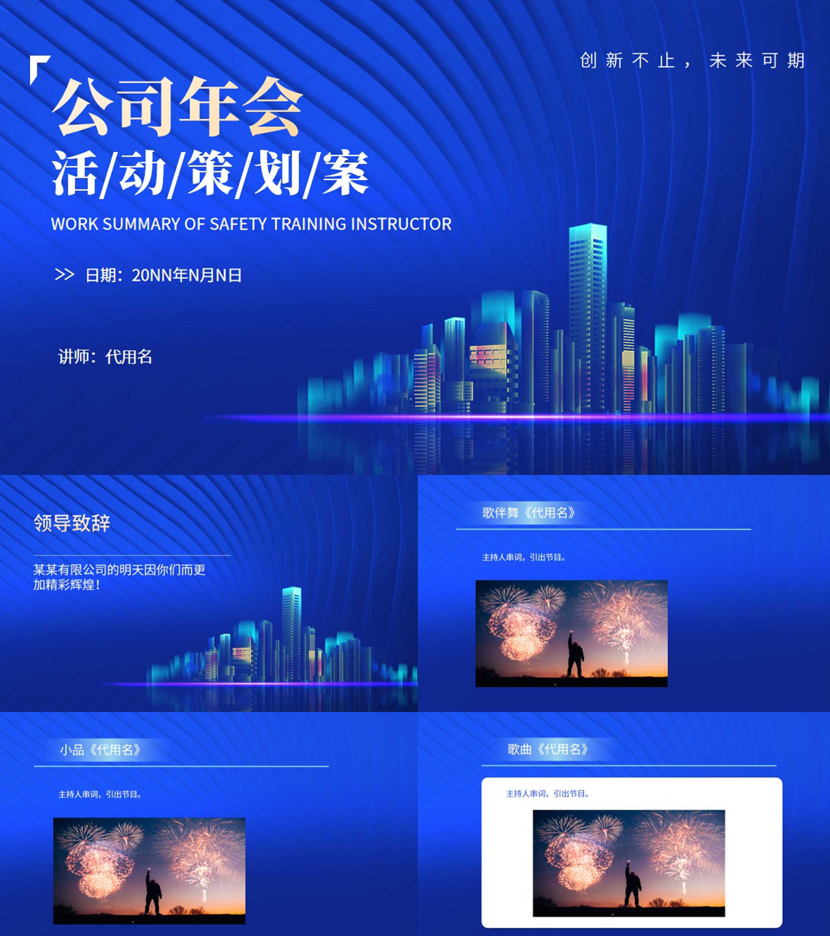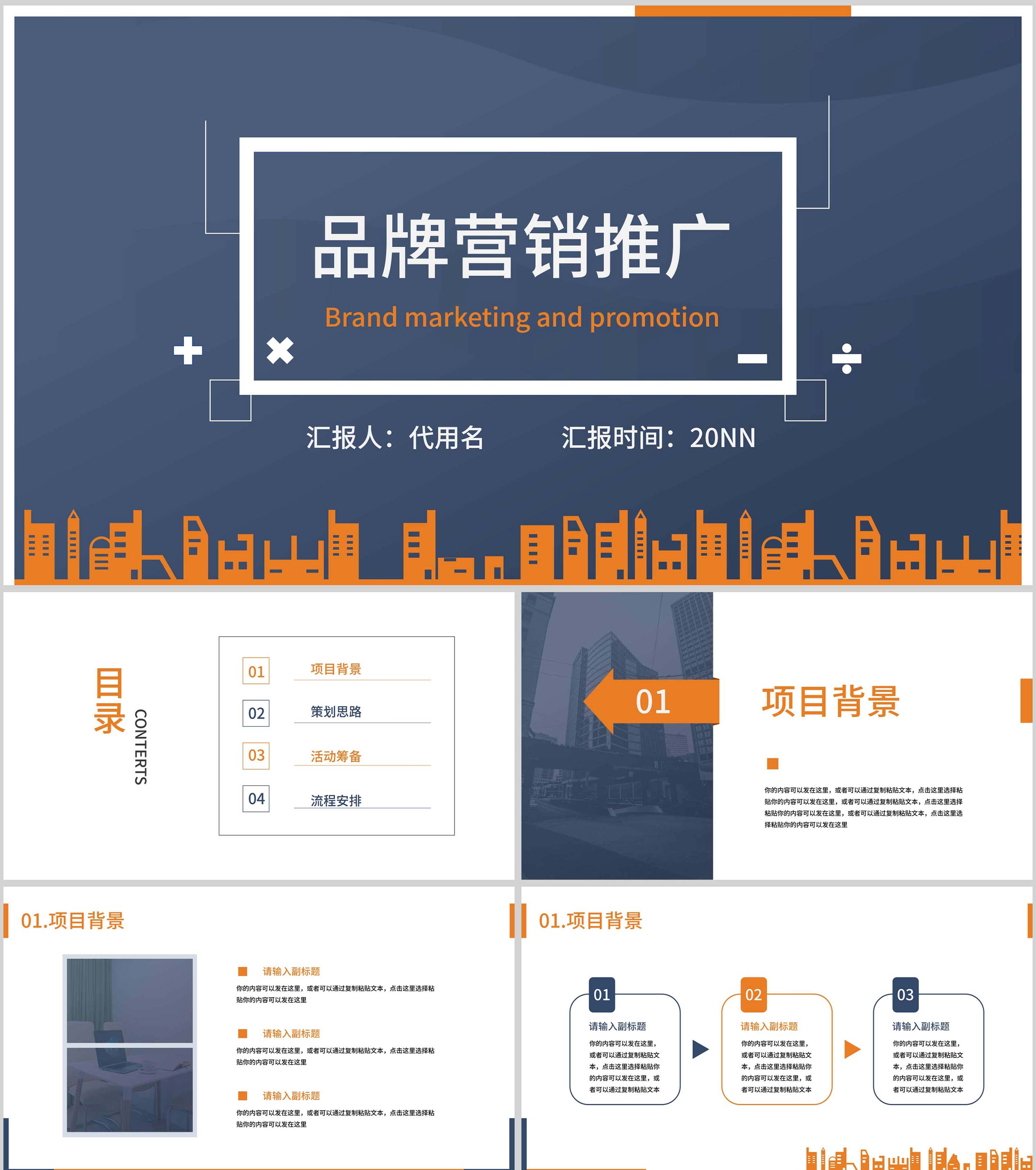 蓝灰色商务风都市剪影品牌营销推广PPT模板