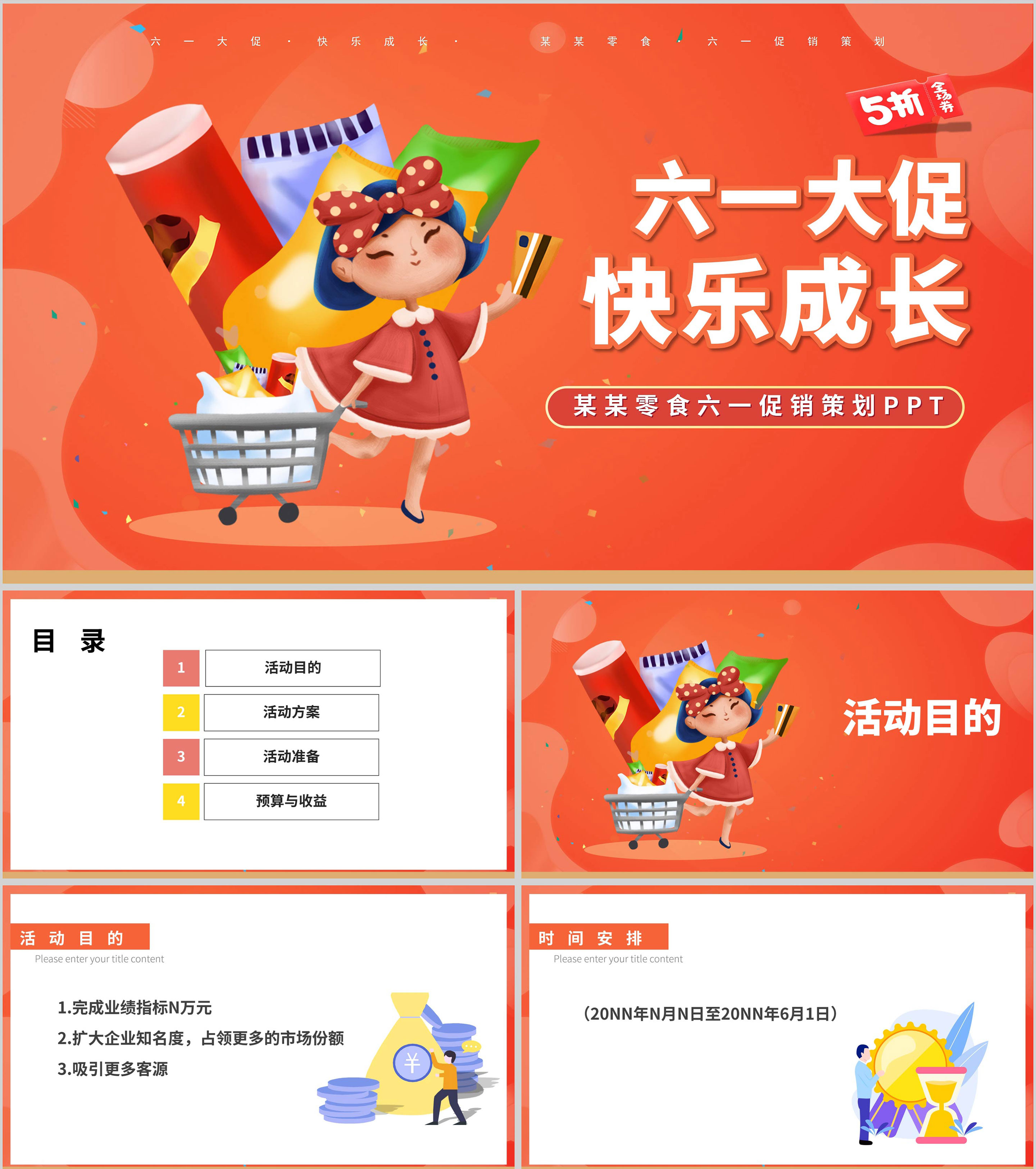 红色插画风儿童节零食女孩营销策划方案PPT模板