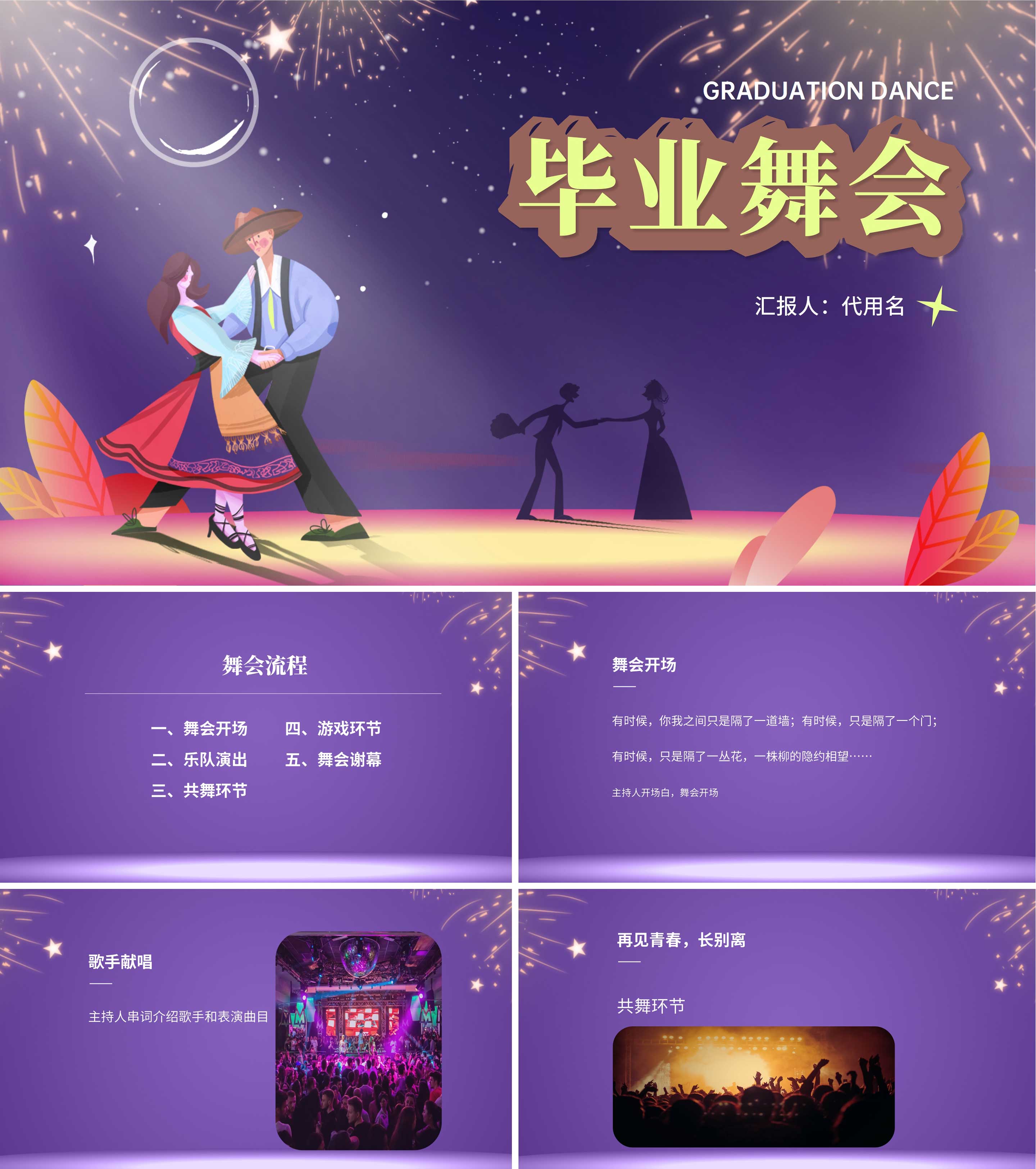 紫色卡通风浪漫毕业舞会流程PPT方案
