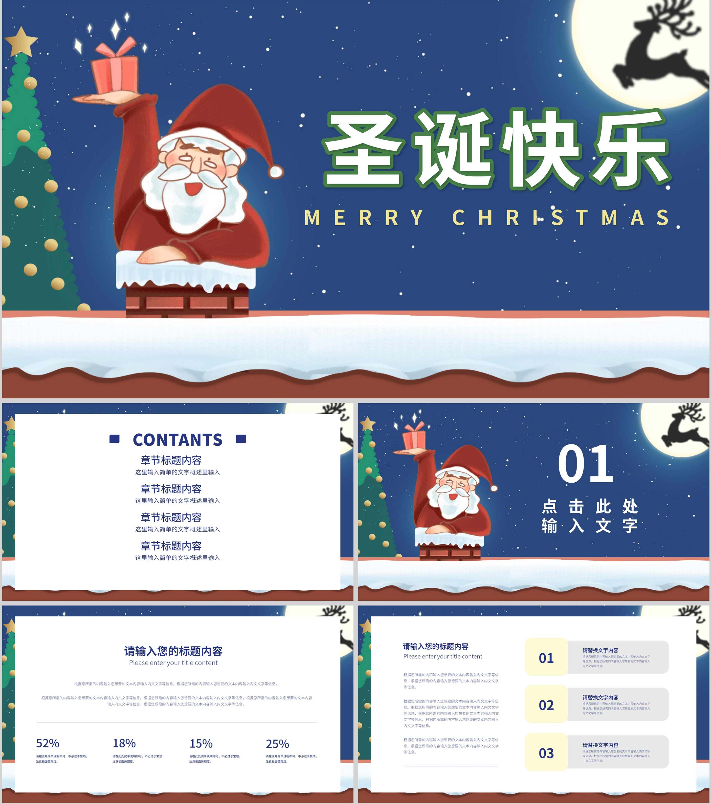 蓝色卡通风屋顶圣诞老人节日PPT模板