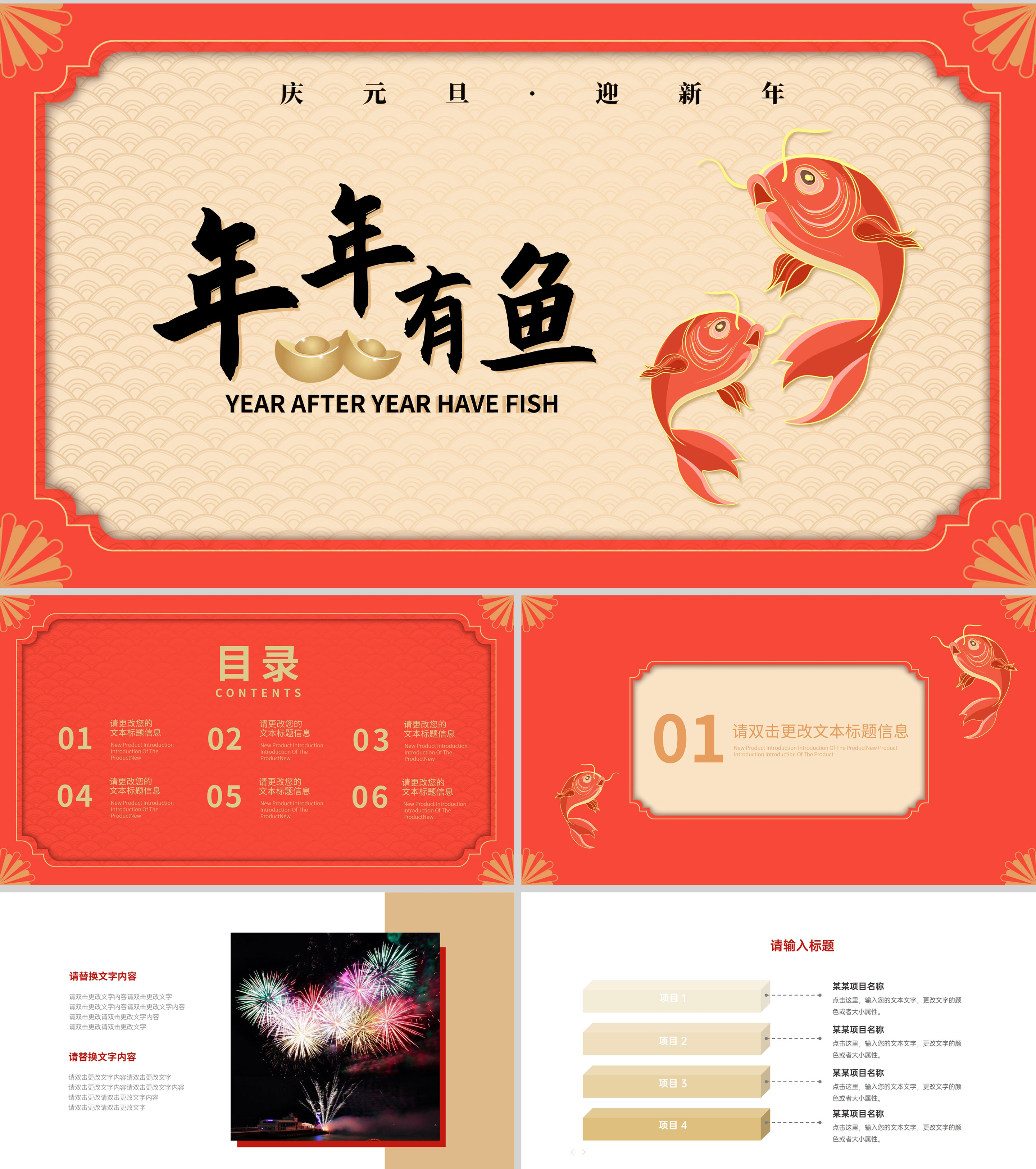 红色中国风锦鲤新年节日庆典PPT模板