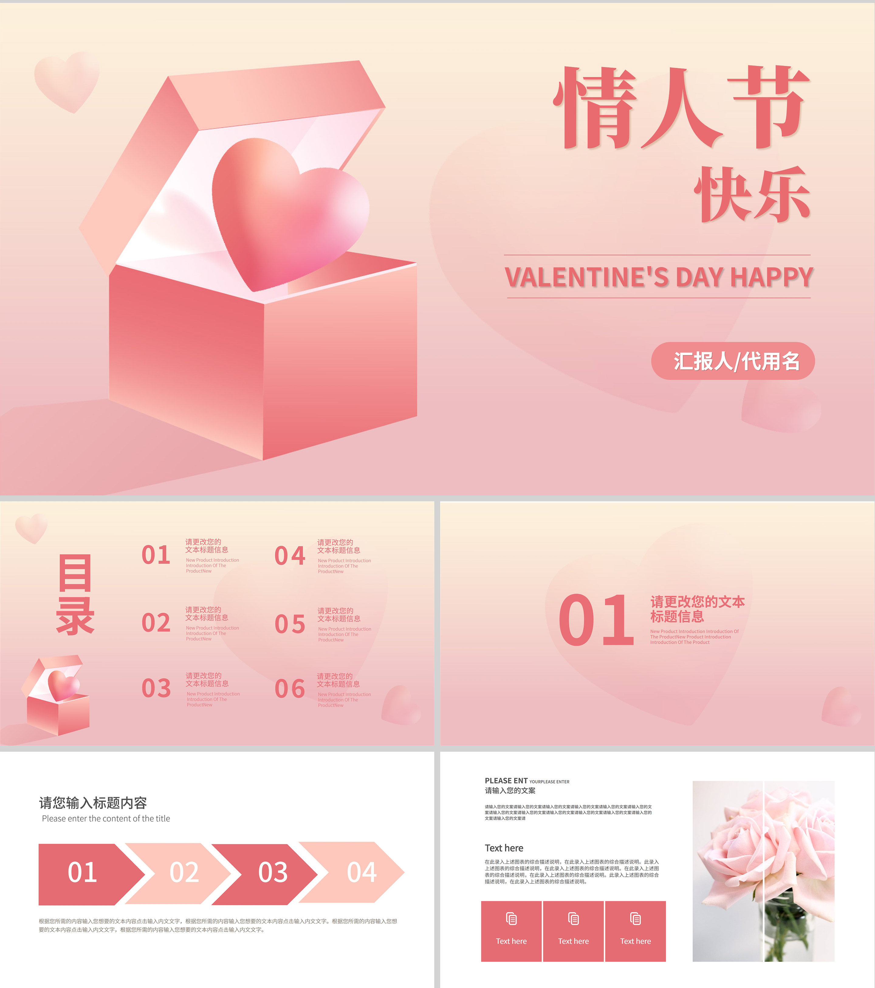 粉色扁平风爱心小礼物浪漫情人节节日PPT模板