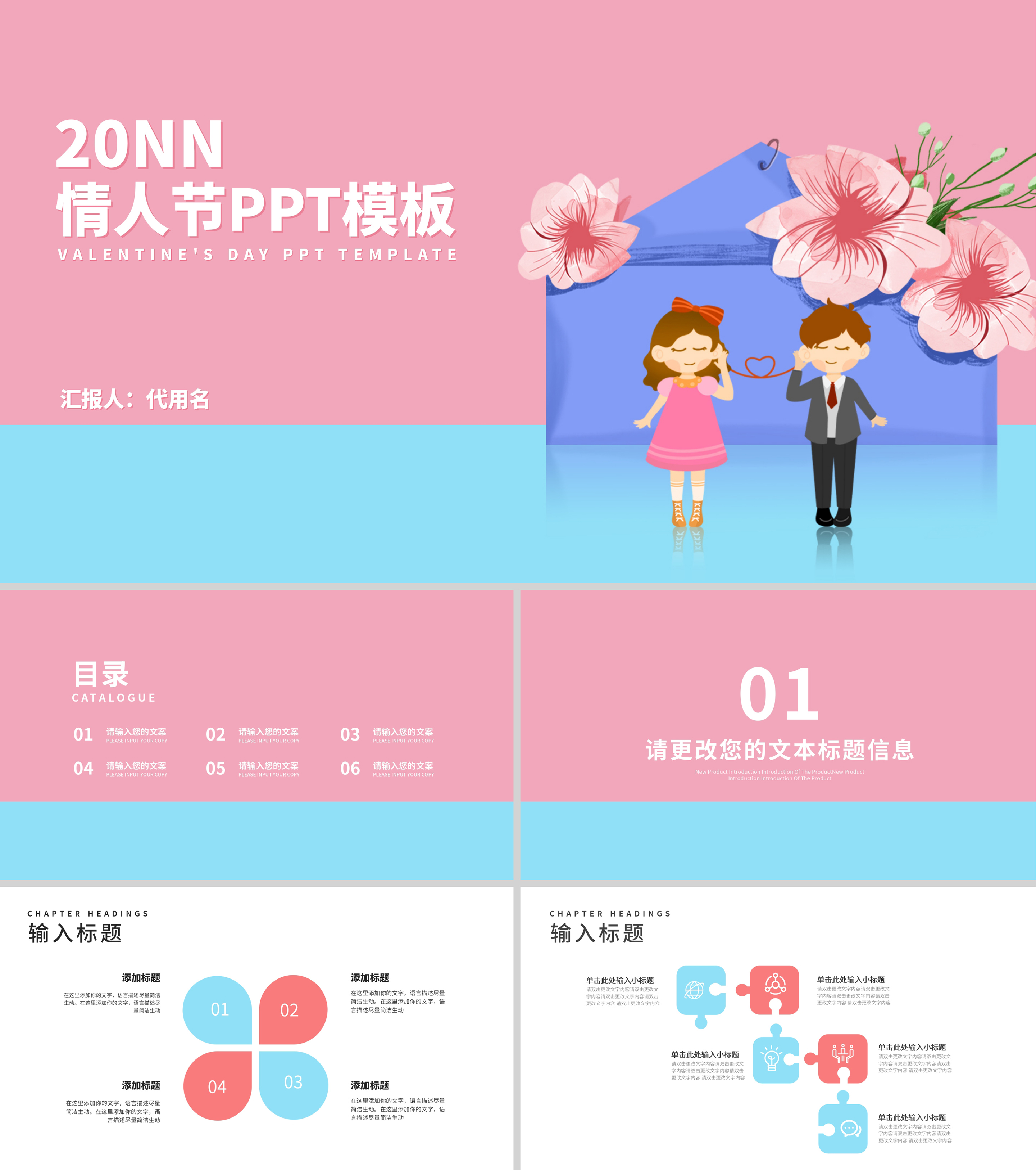 粉色卡通风浪漫情人节情侣娃娃PPT模板