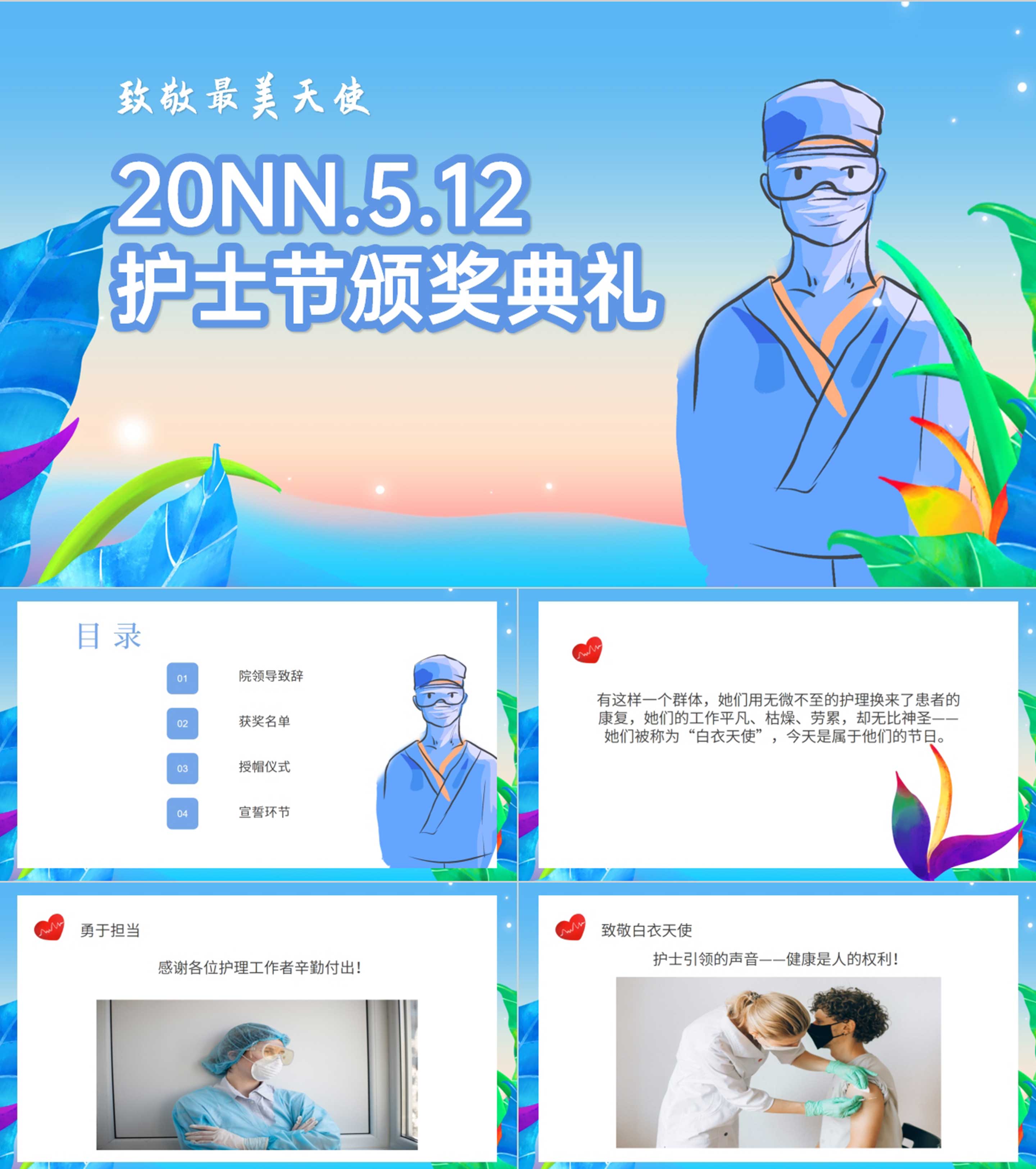 蓝色插画风护士节疫情庆典颁奖典礼PPT模板