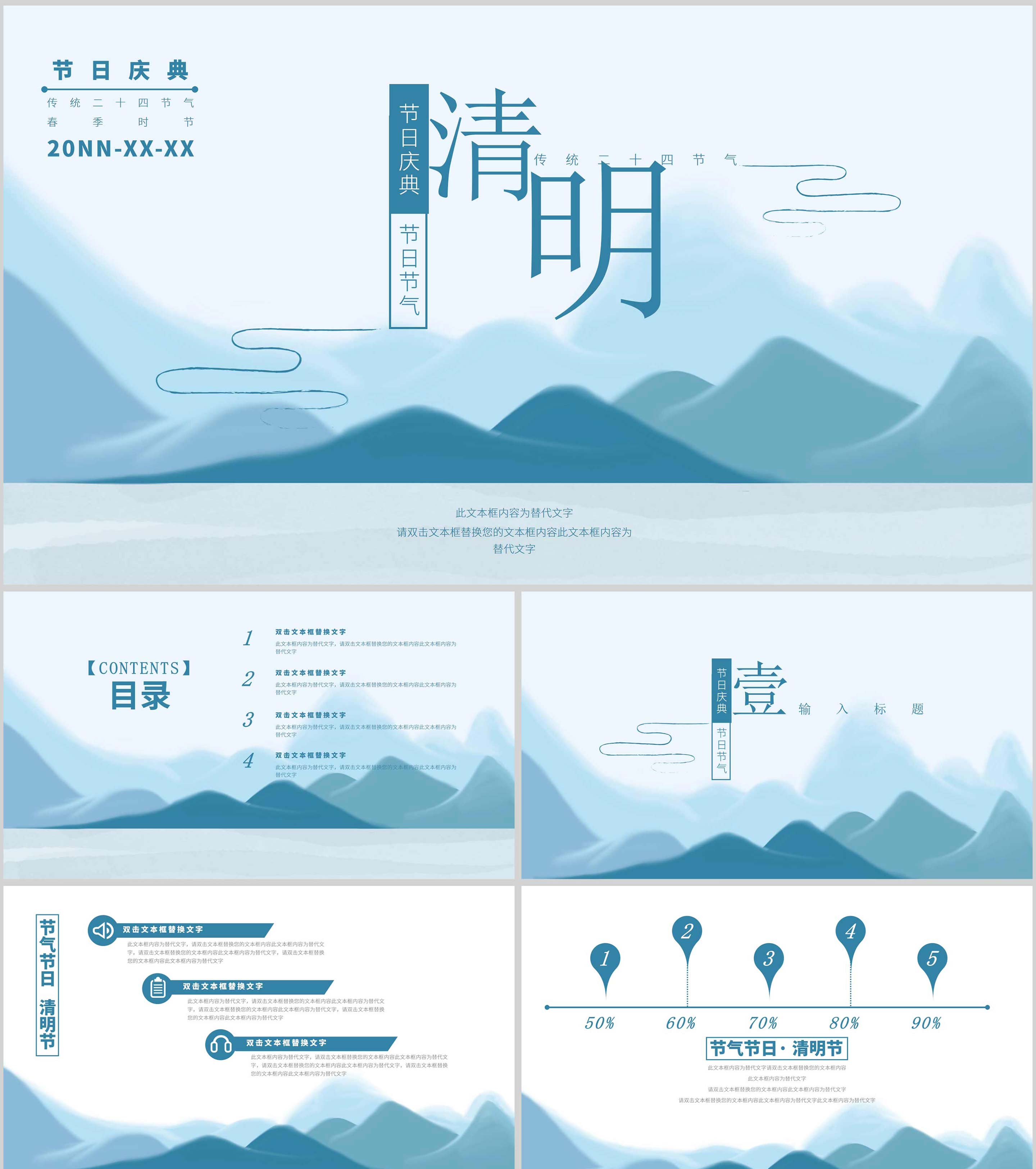 蓝色中国水墨风清明节主题PPT模板