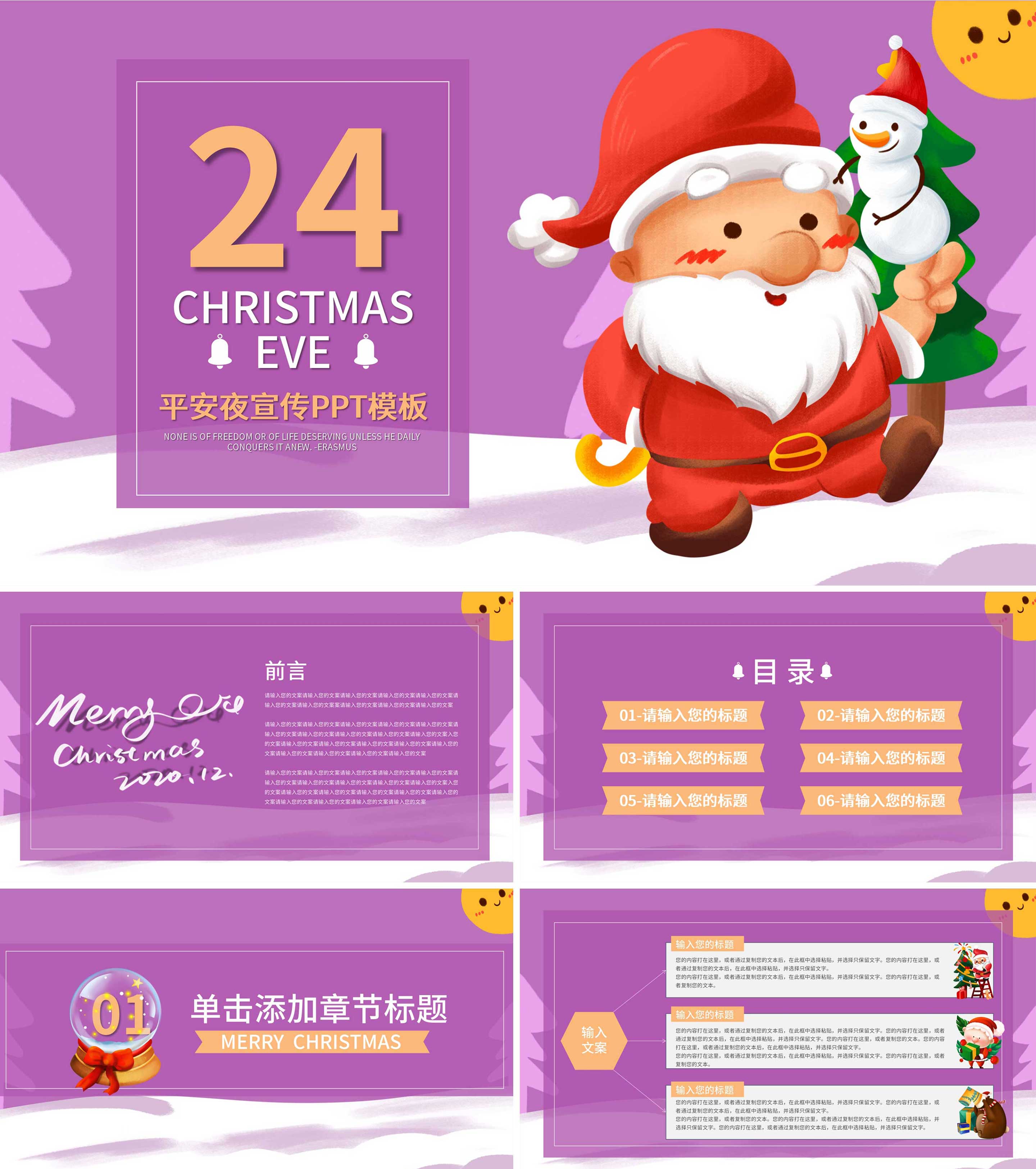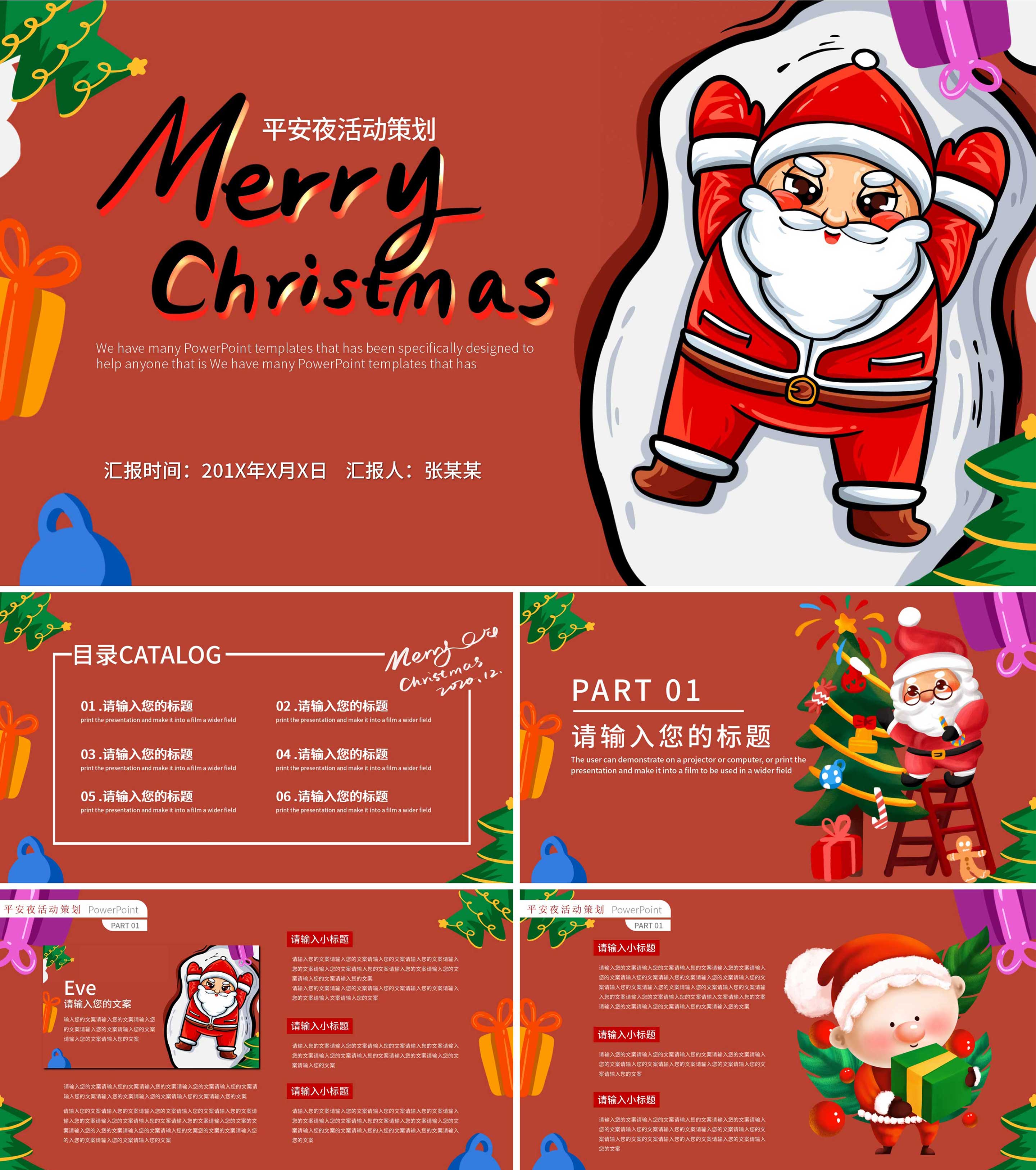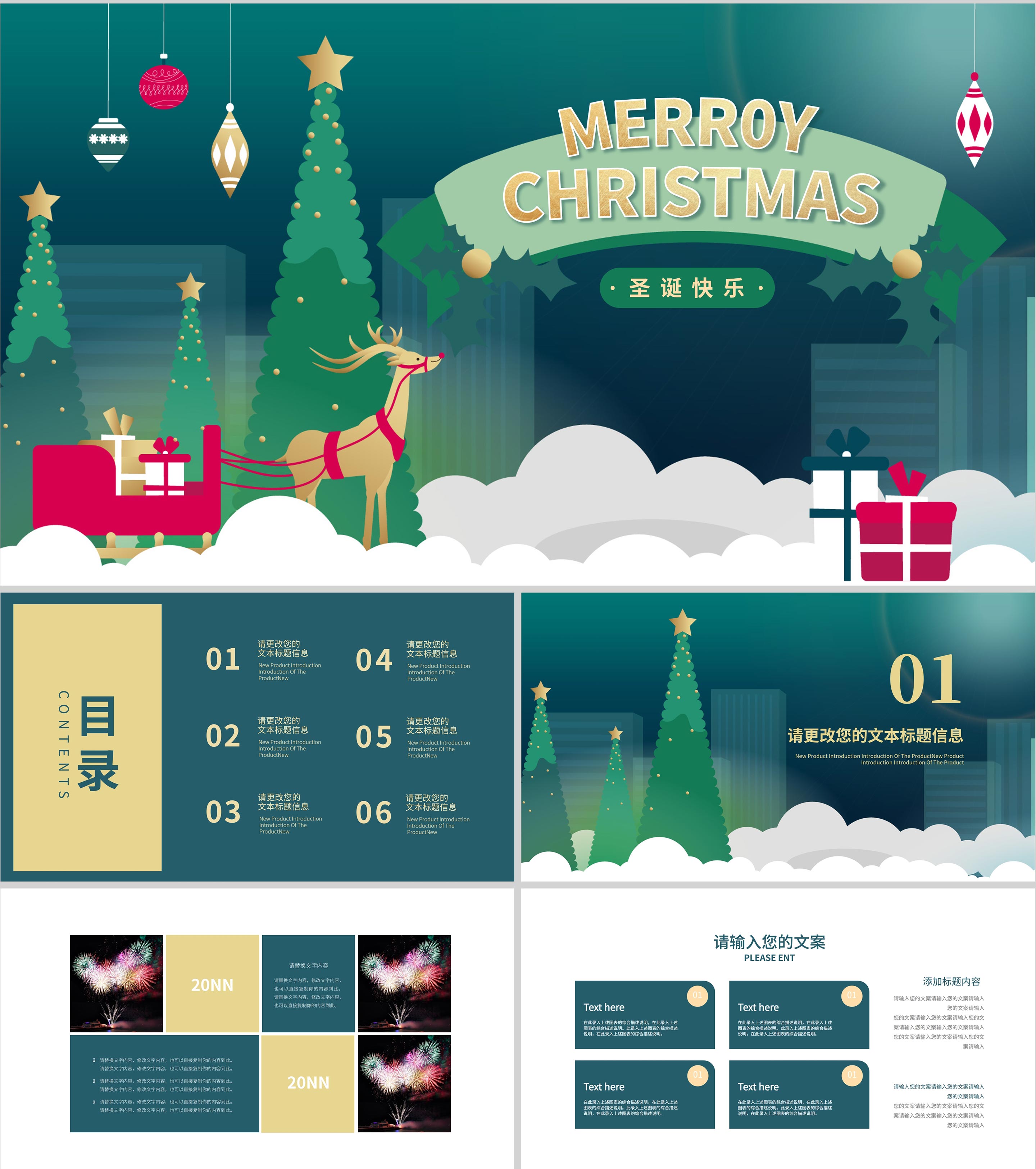 绿色插画风唯美送礼物麋鹿圣诞节节日PPT模板