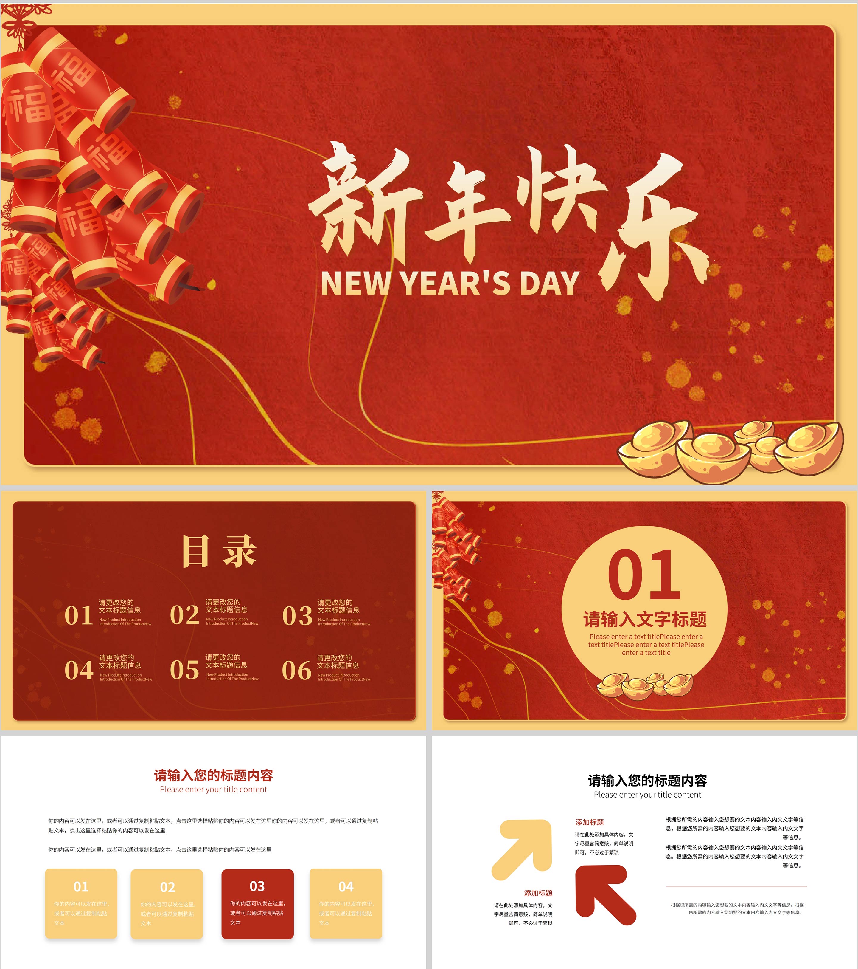 红色插画风新年鞭炮发财吉祥节日PPT模板