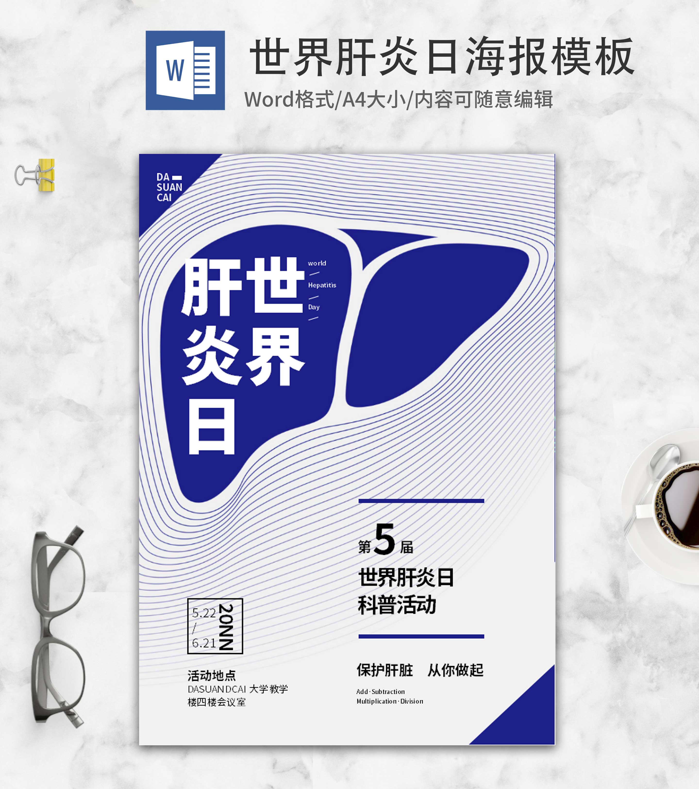 蓝色简约世界肝炎日海报word模板