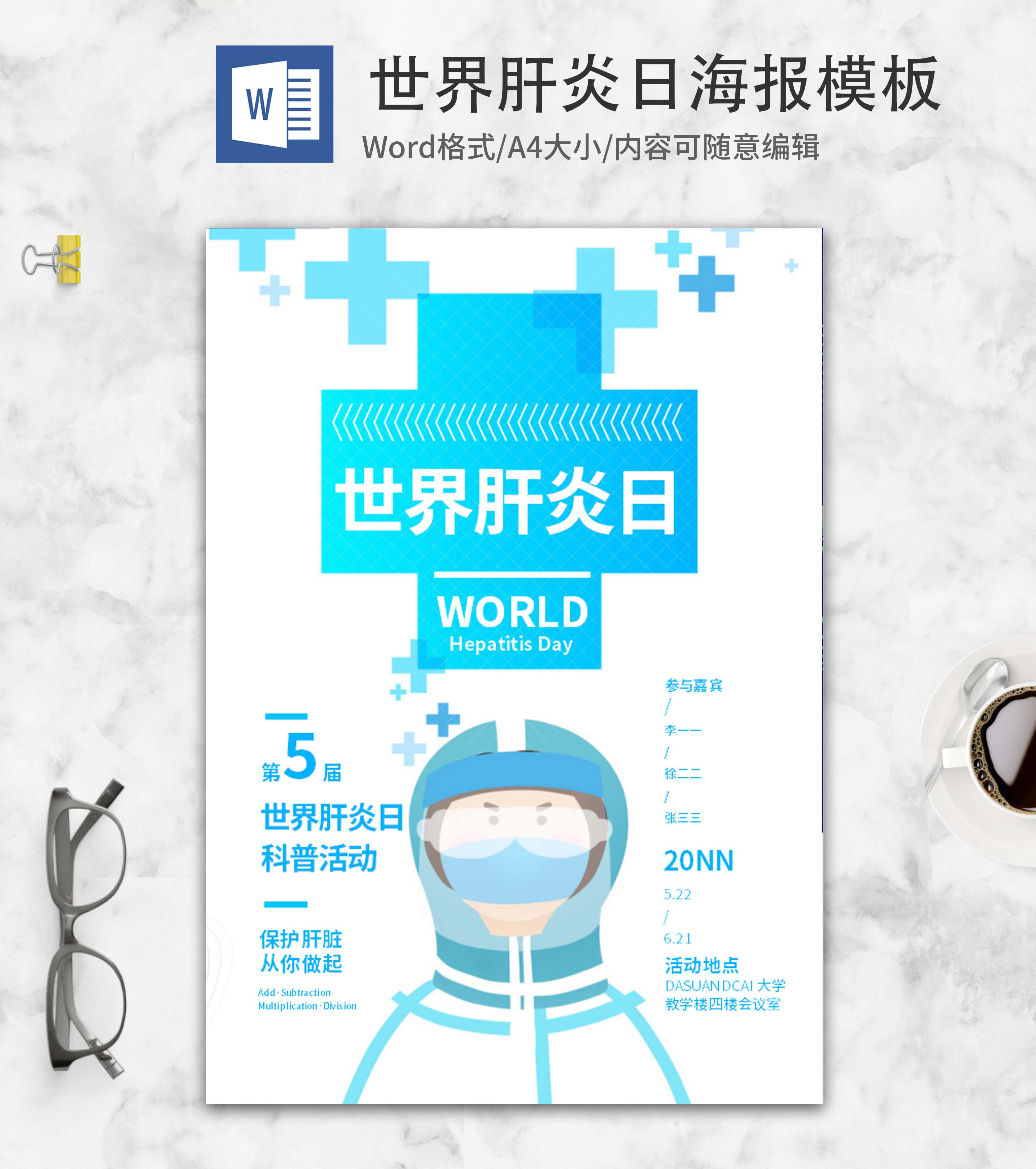 蓝色创意简约世界肝炎日word模板