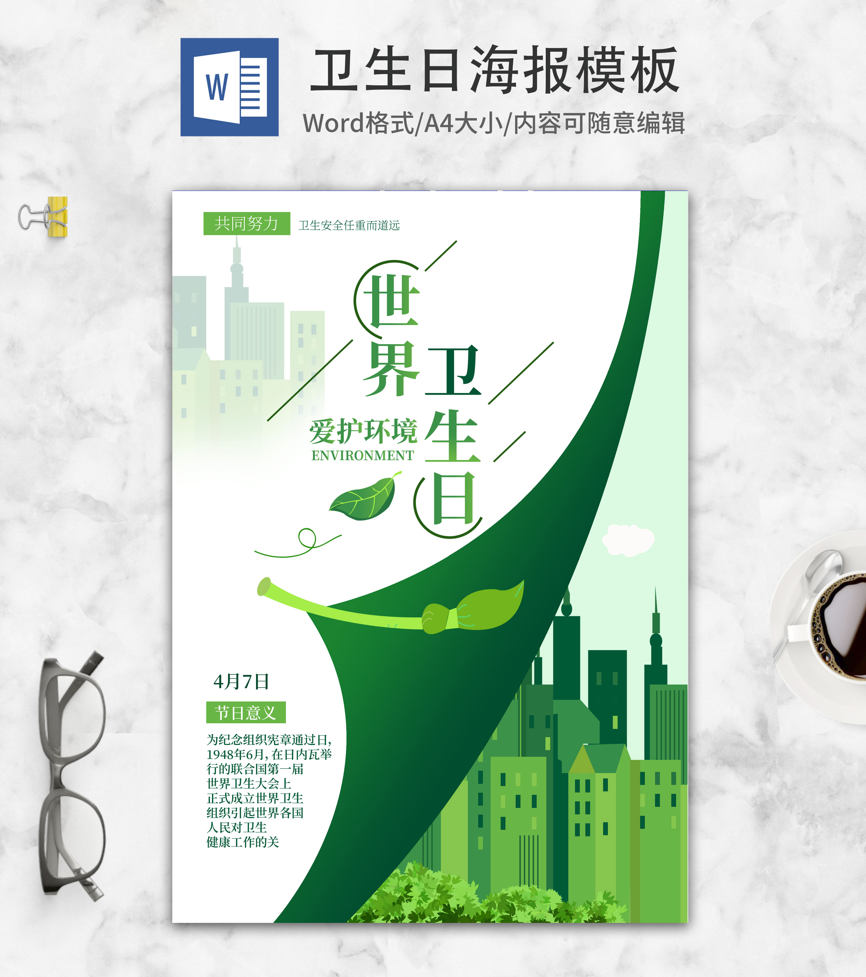 绿色手绘世界卫生日海报