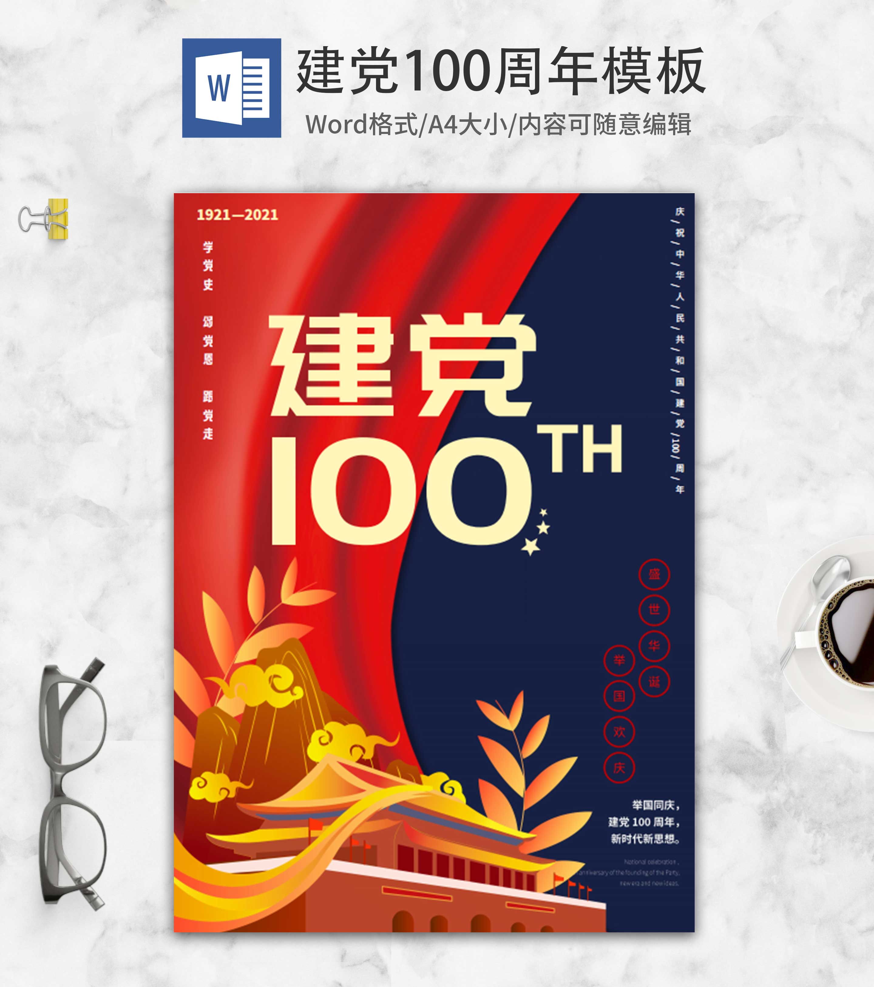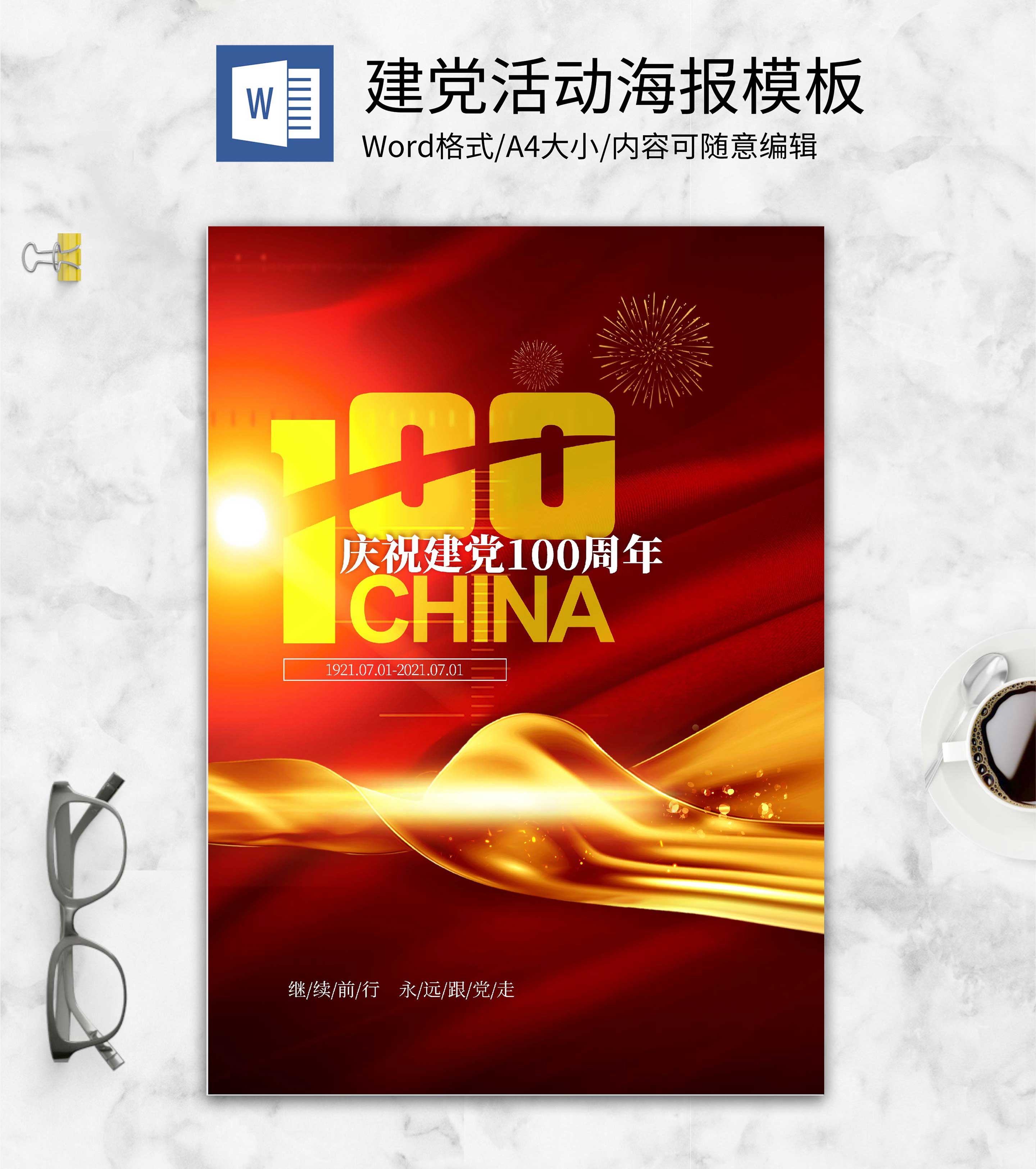 红蓝建党100周年海报word模板