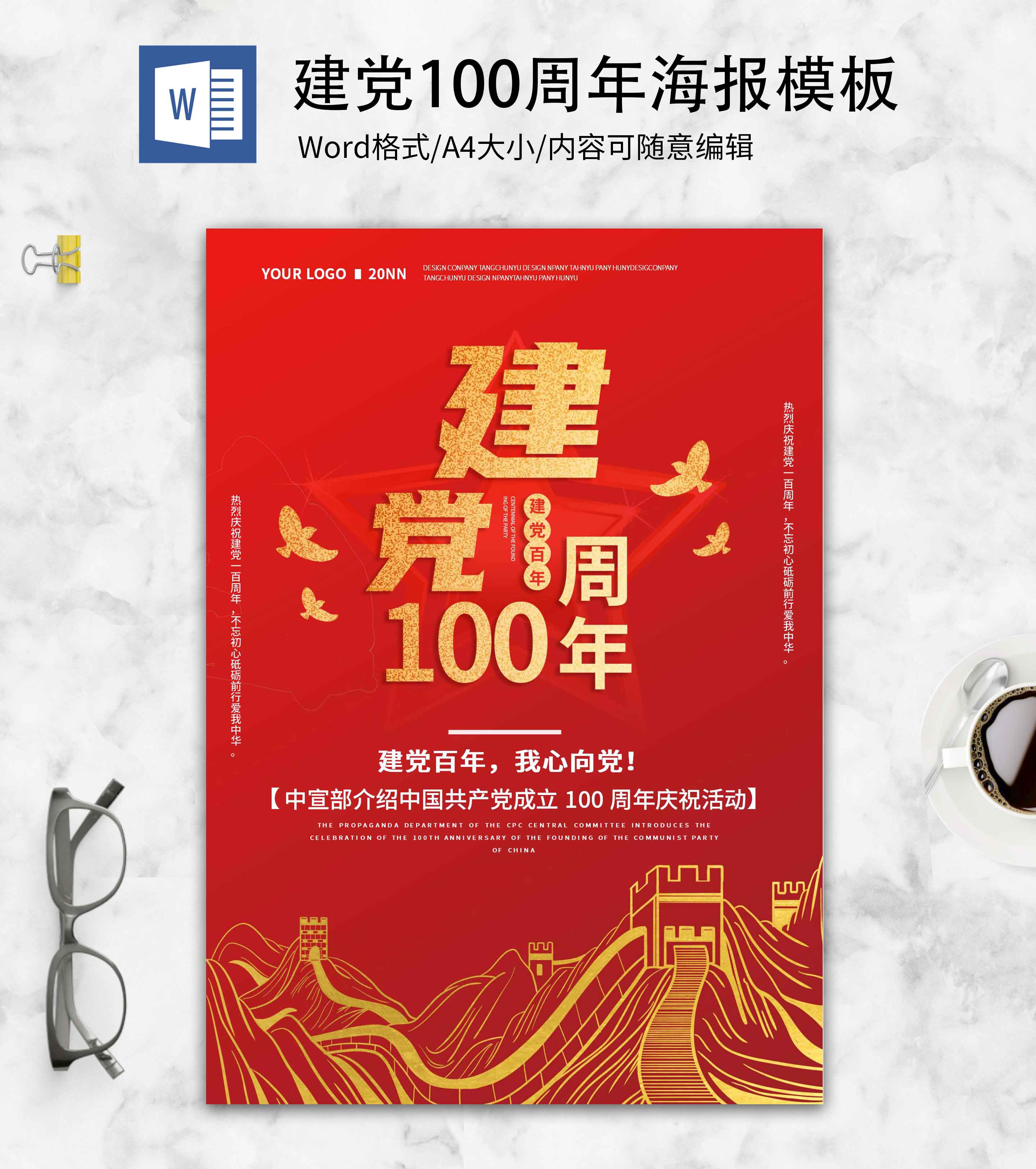 党政风红色建党100周年海报word模板
