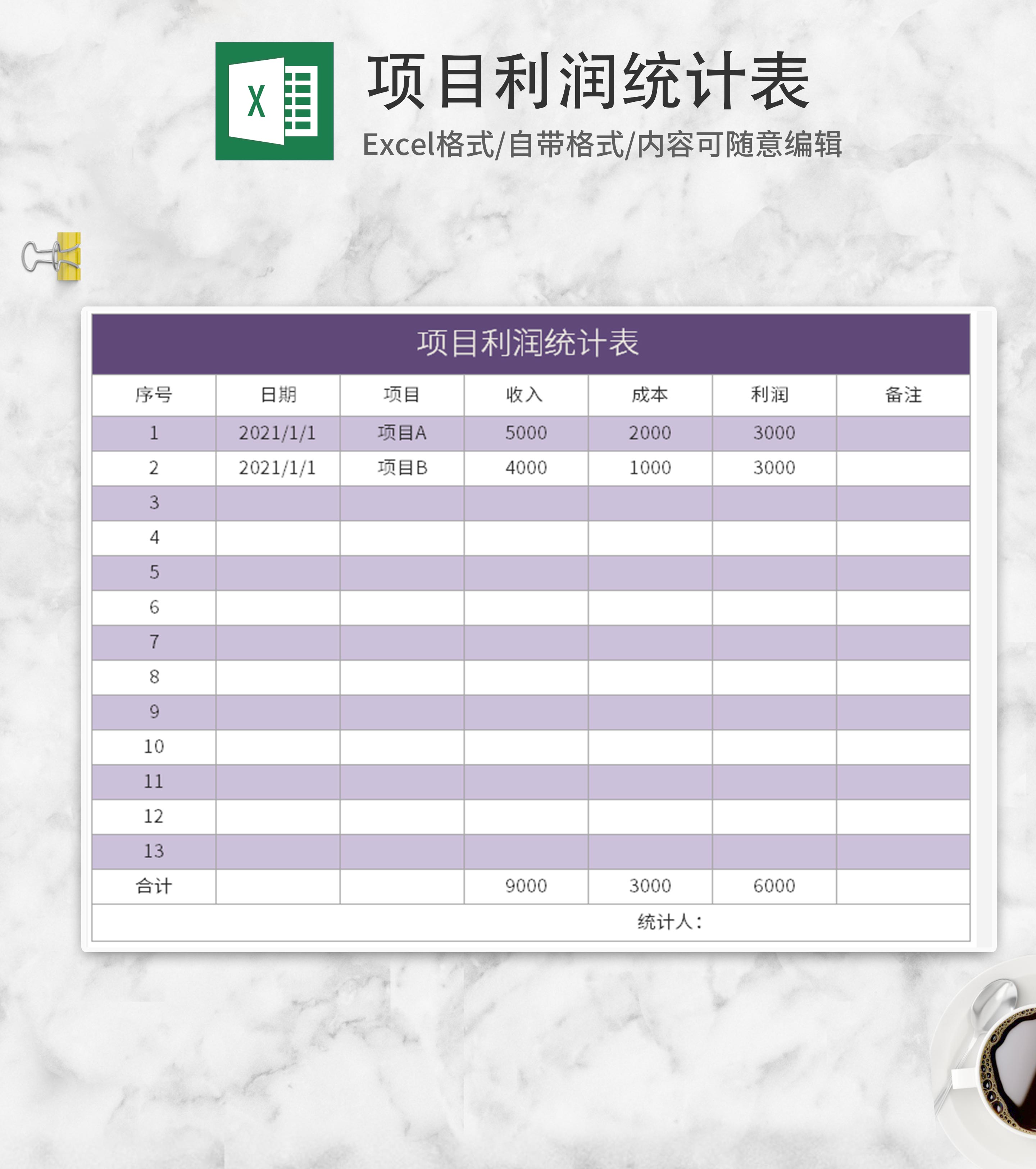 紫色项目利润统计表Excel模板