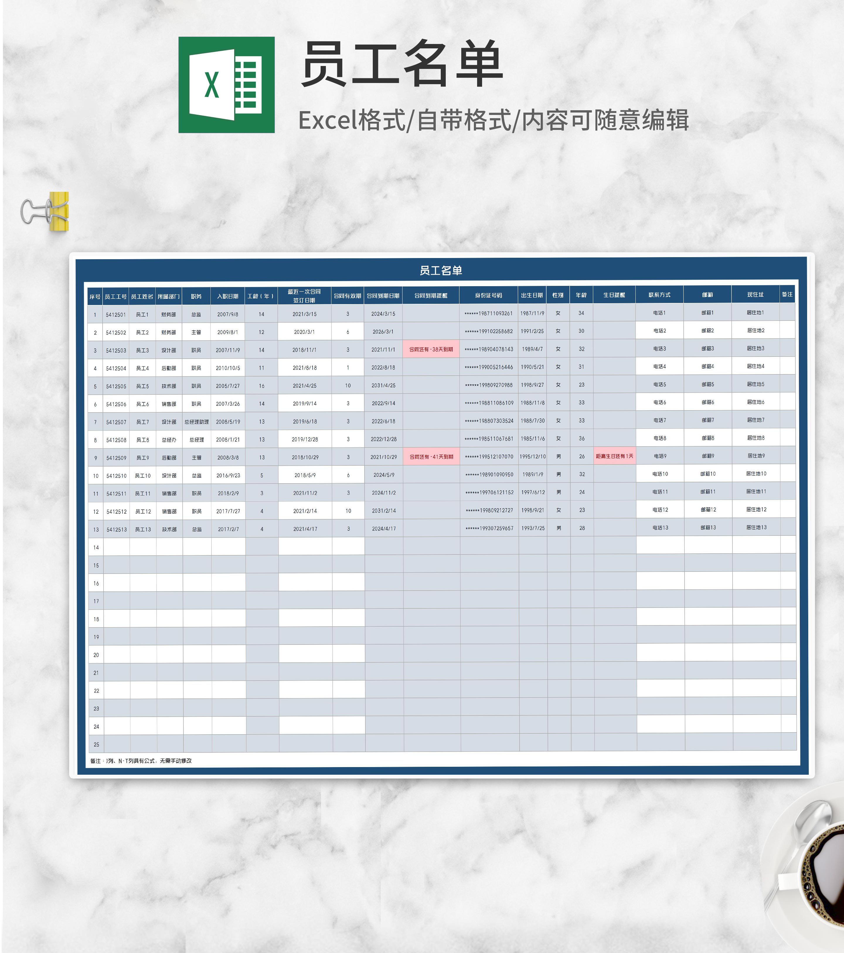 蓝色公司员工在职名单Excel模板