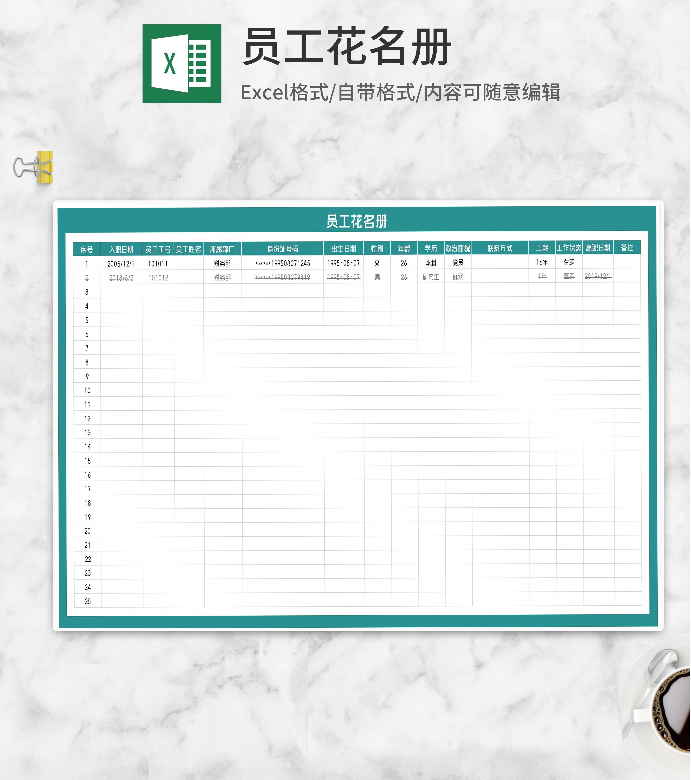 公司员工资料信息花名册Excel模板