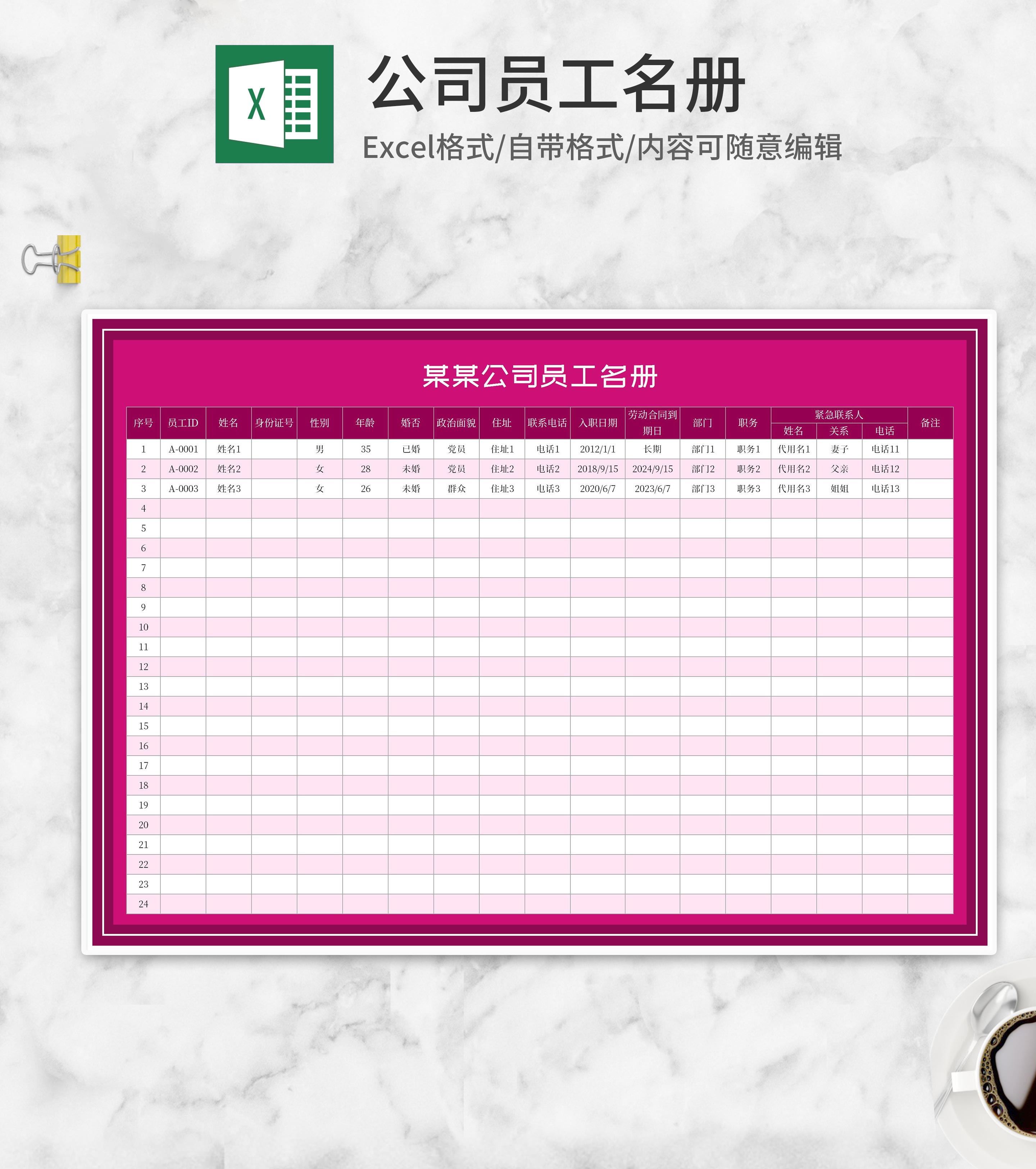 粉色公司员工信息名册Excel模板