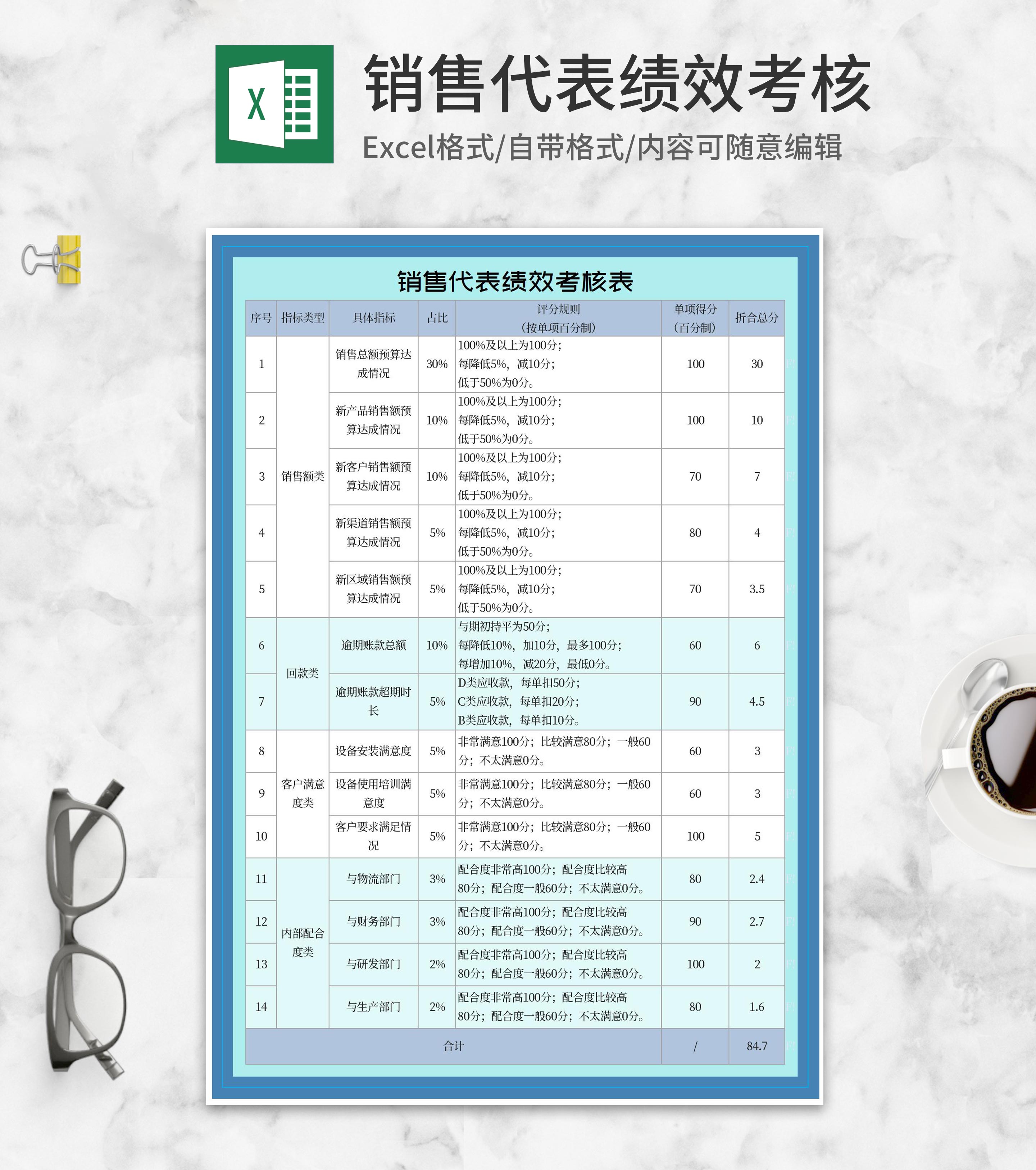 蓝色销售代表绩效考核表Excel模板