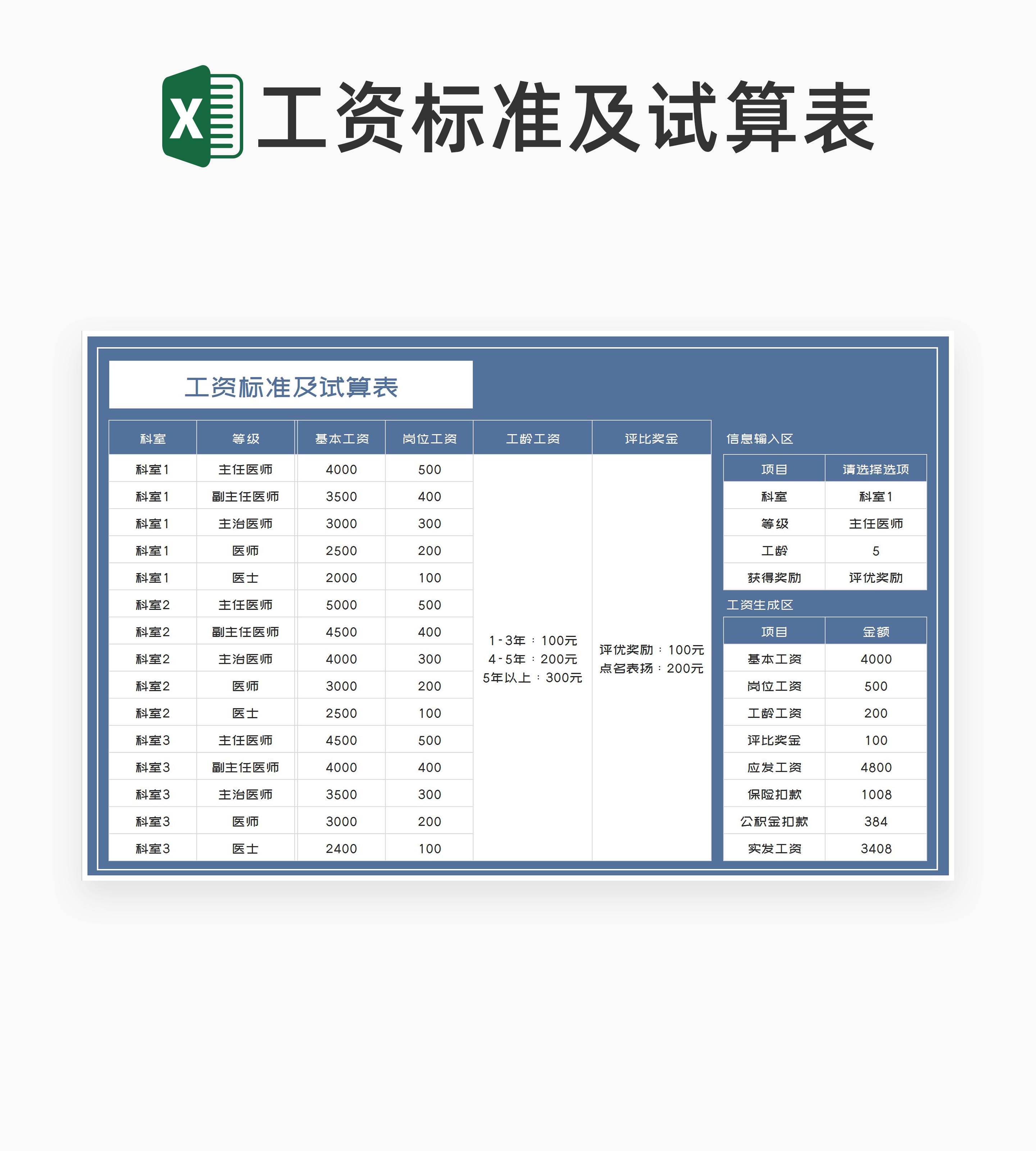 蓝色医院工资标准及试算表Excel模板
