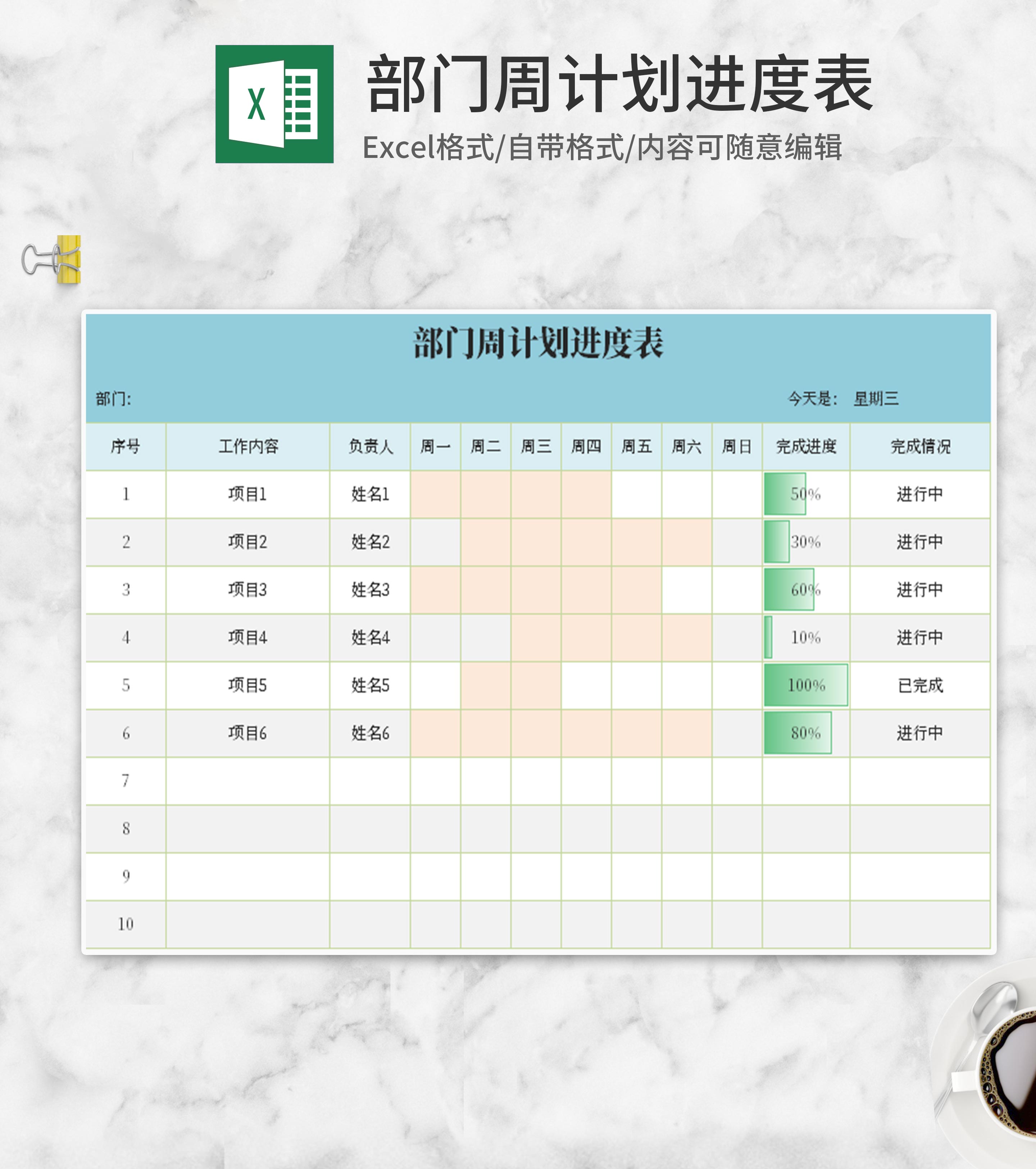 小清新蓝色部门周计划进度表Excel模板