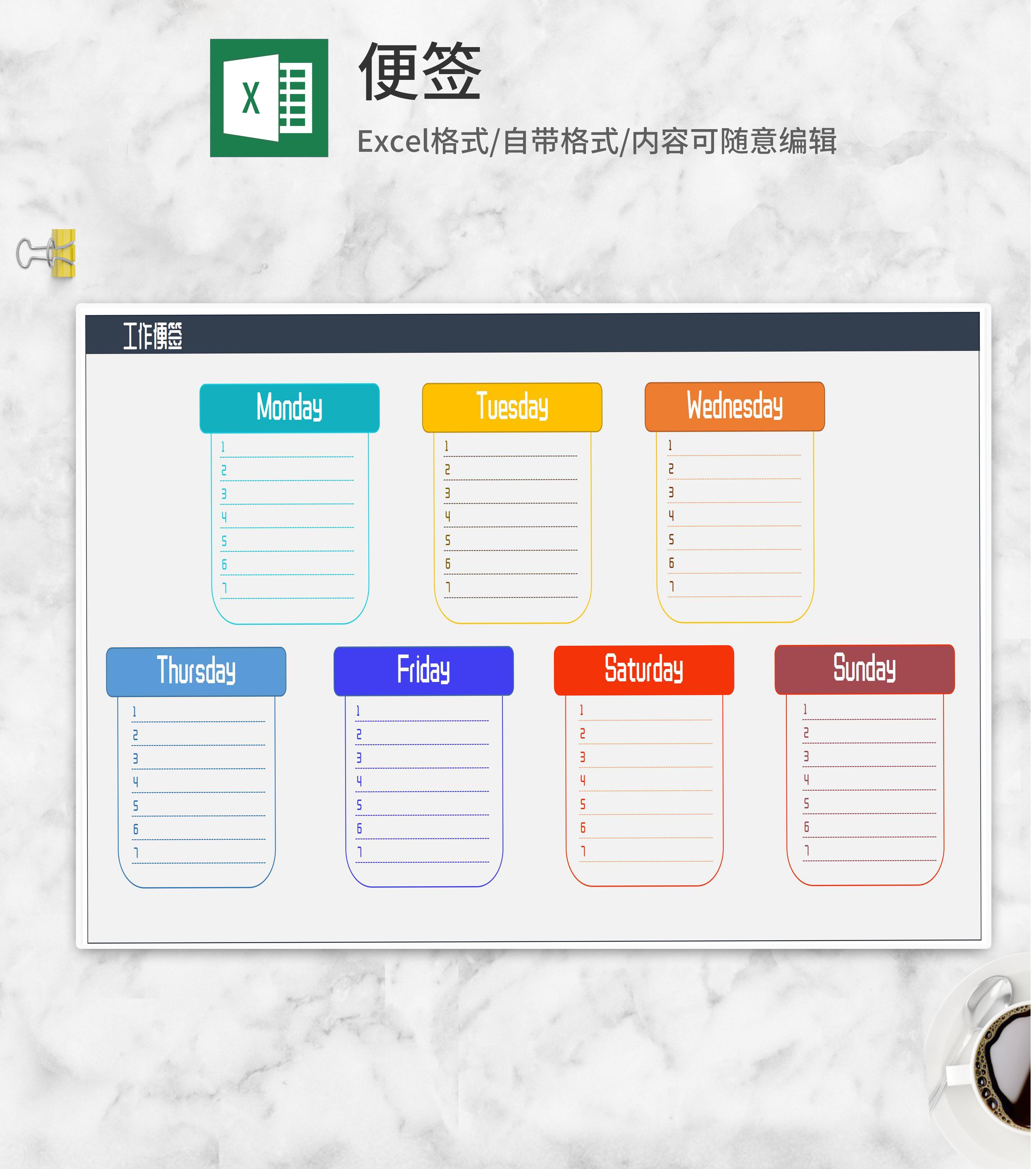 简约彩色七天工作便签Excel模板