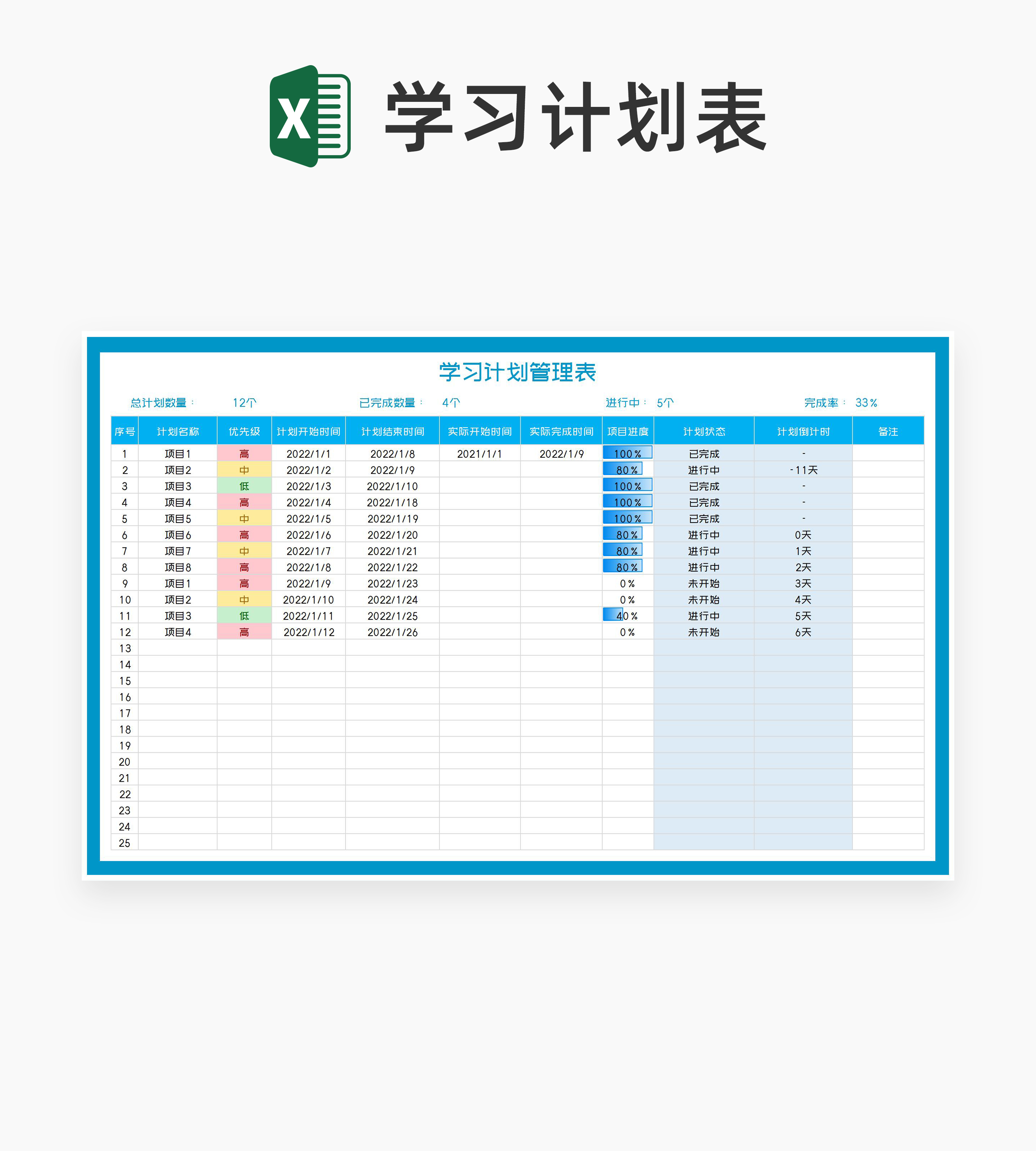 蓝色学习计划管理表Excel模板