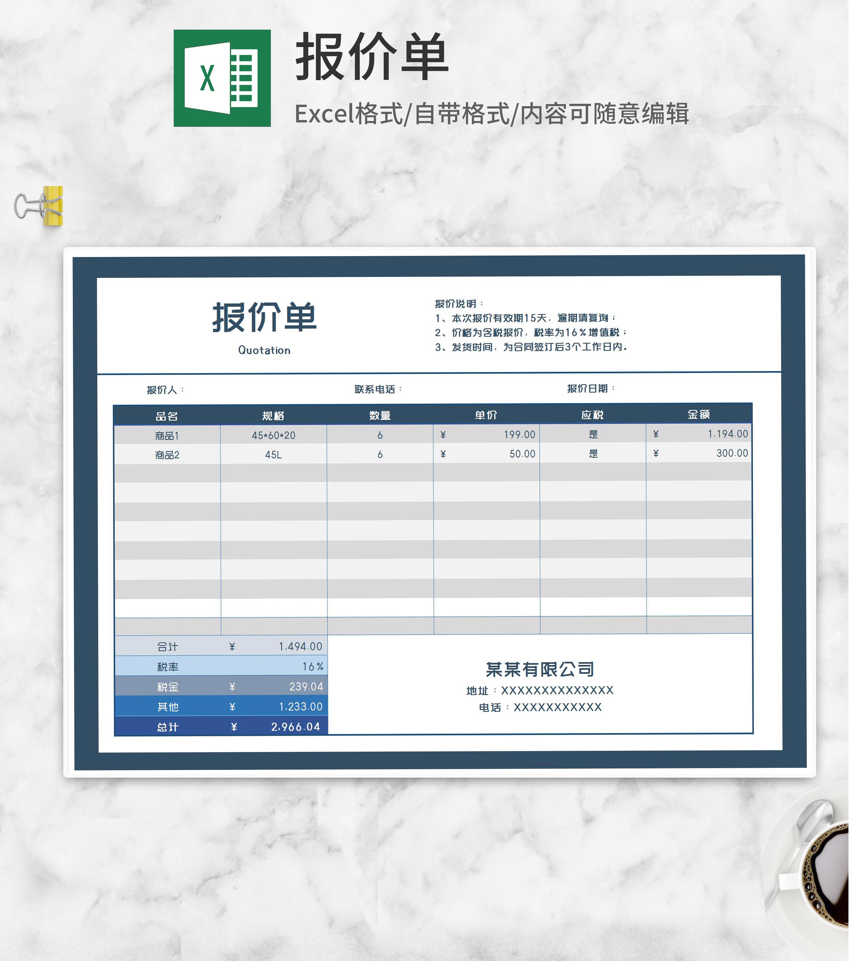 蓝色公司产品报价表Excel模板