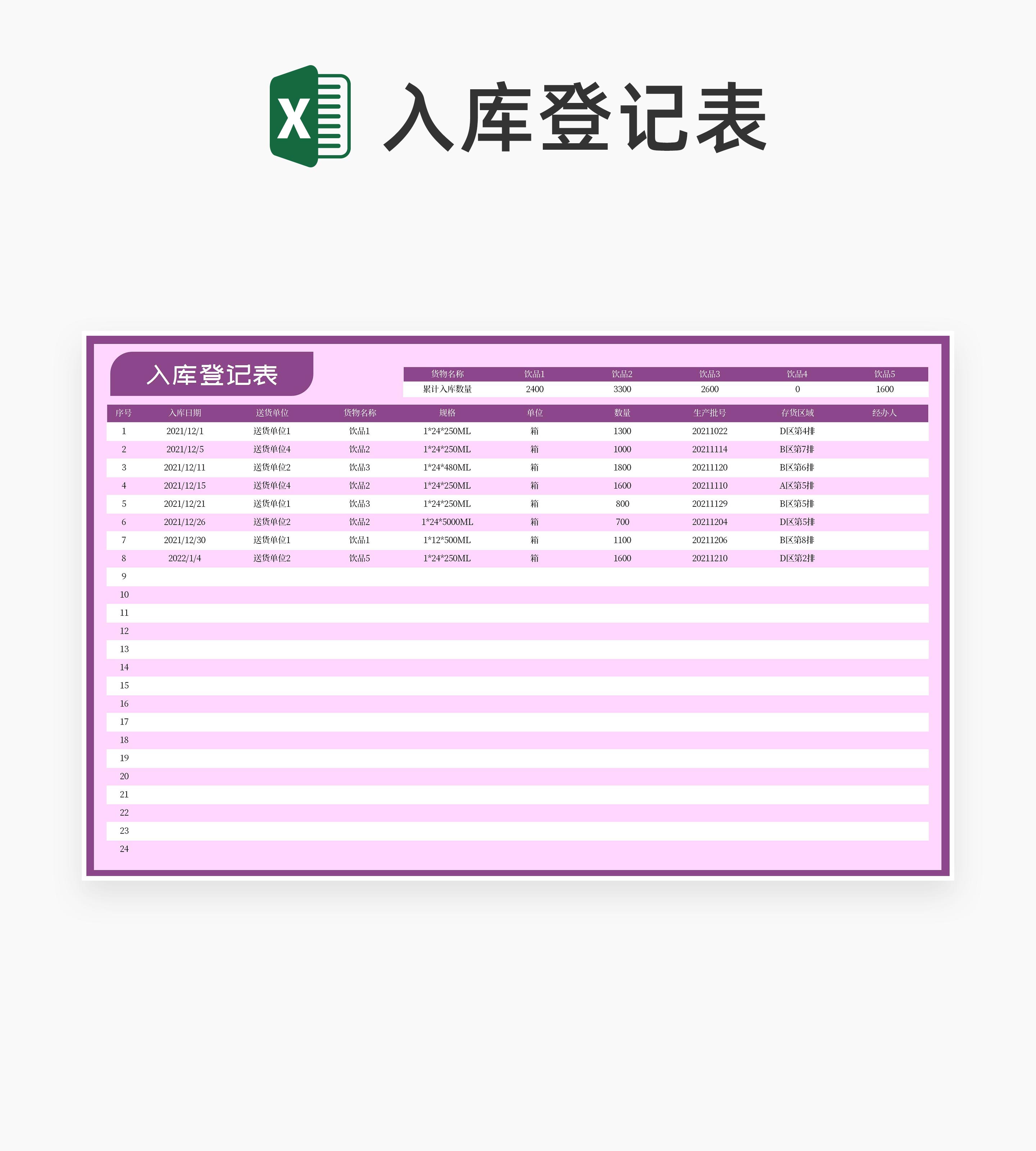 紫色货物入库登记表Excel模板