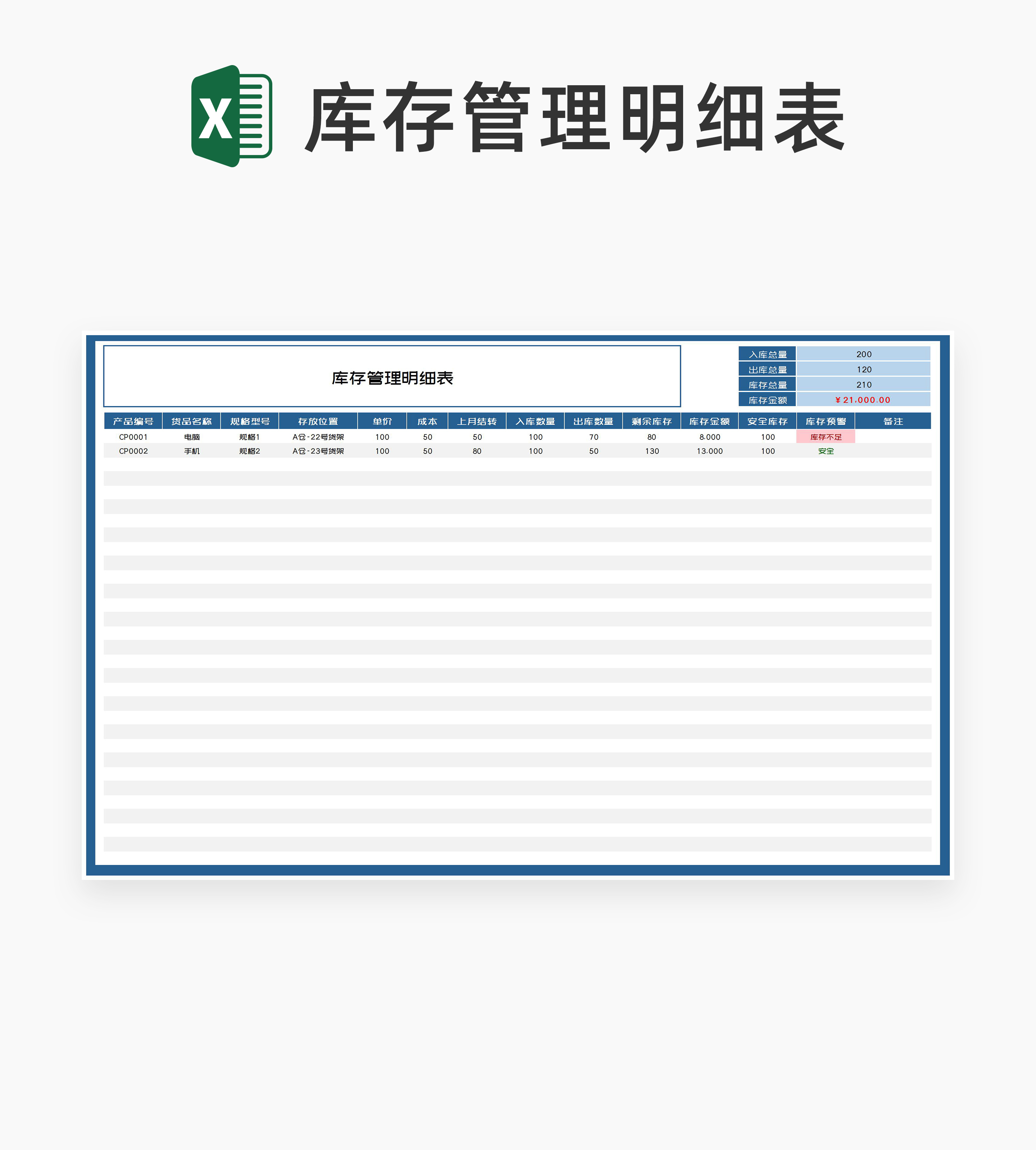 简约蓝色货品库存管理明细表Excel模板