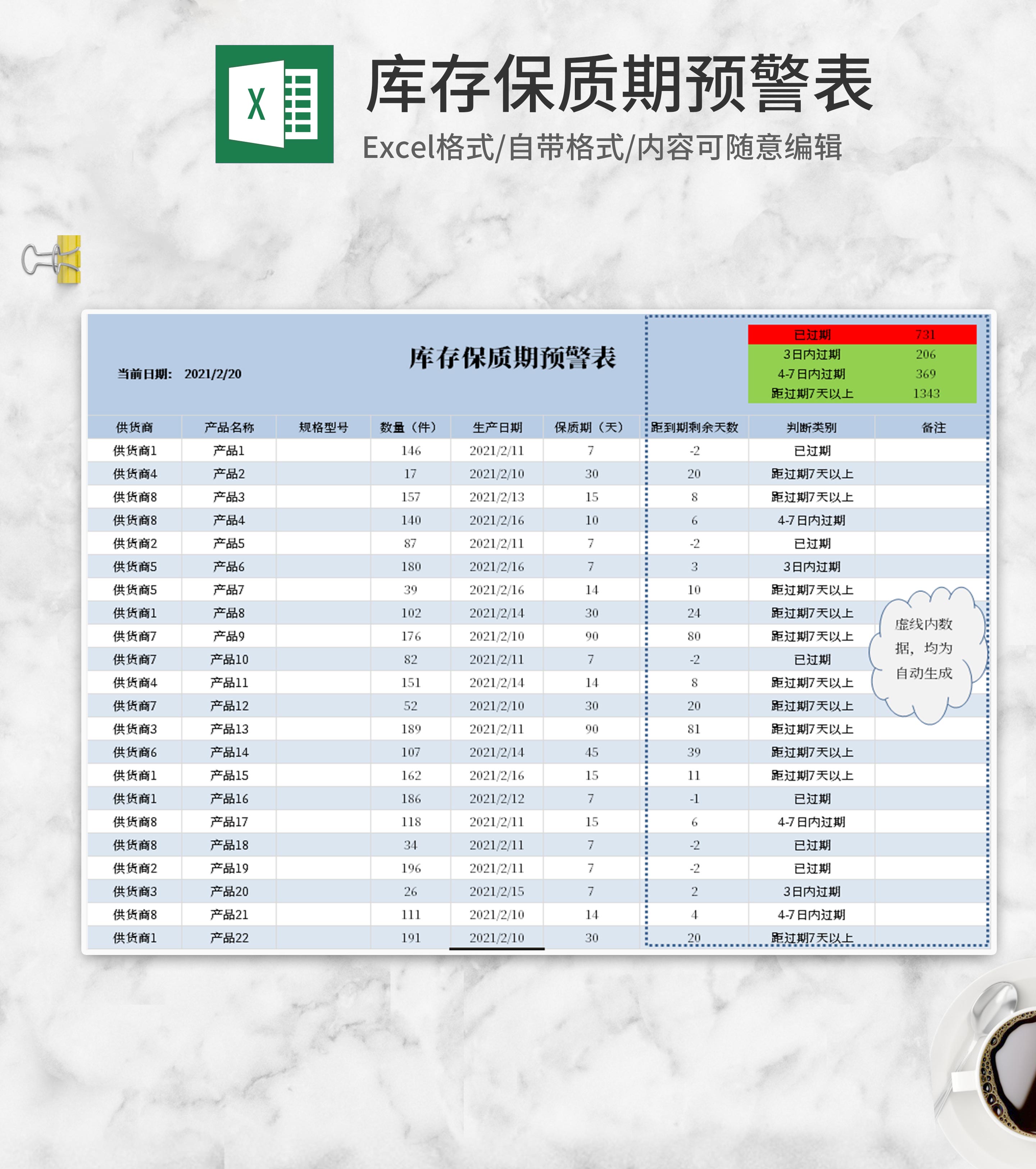 小清新蓝色库存保质期预警Excel模板