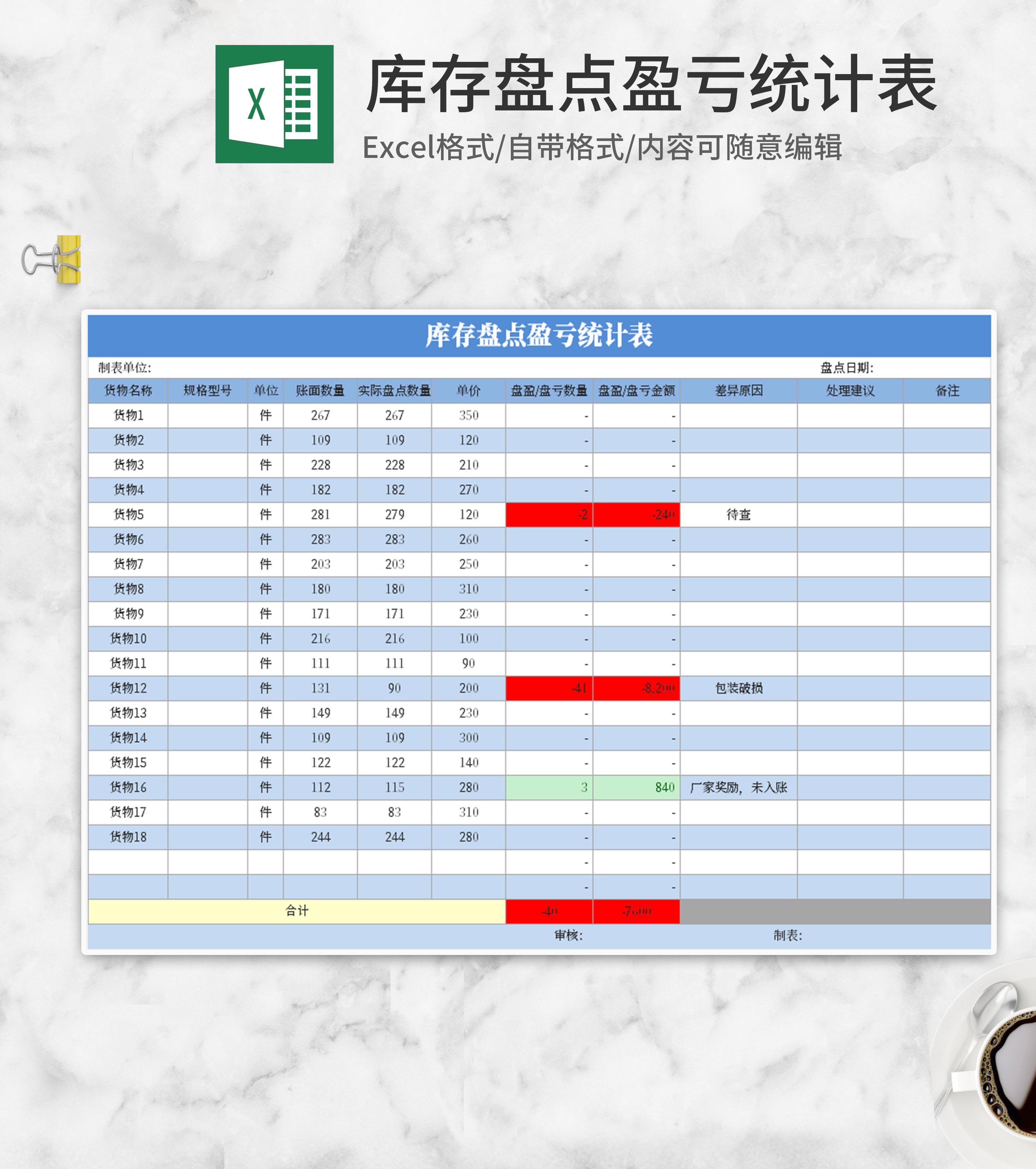 小清新蓝色库存盘点盈亏统计表Excel模板
